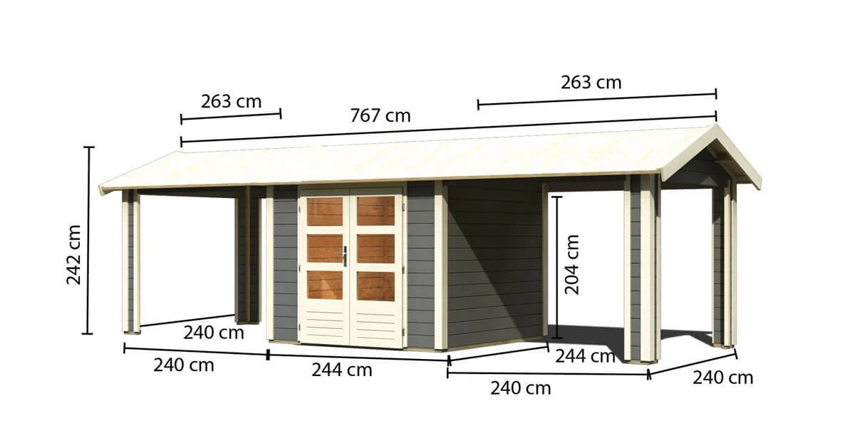 Wahlweise kann das Gartenhaus Naturbelassen oder werksseitig in Terragrau behandelt erworben werden. Zudem kann man optional ein oder zwei Dachausbauelemente an das Gartenhaus bauen. Dieses Anbaudach geht optisch nahtlos in das Haus ĂĽber. So entsteht weiterer Platz, der beispielsweise als Stauraum oder ĂĽberdachte Terrasse genutzt werden kann.Â