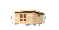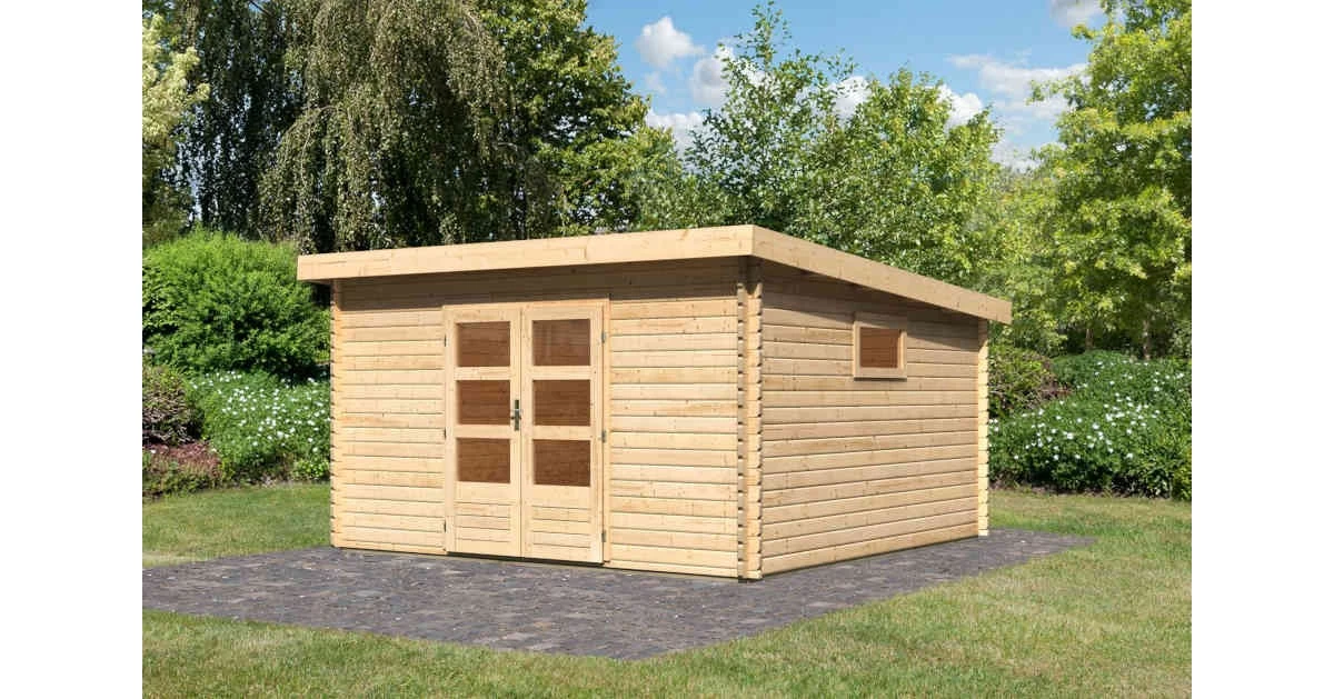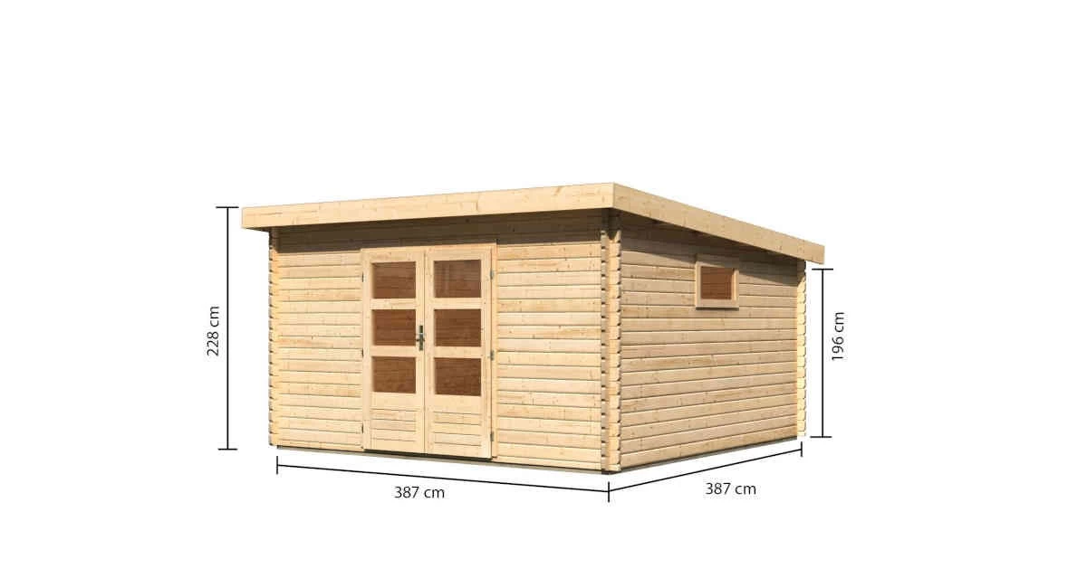 Für jeden Garten das Richtige mit dem Gartenhaus Trittau 6. Das Gartenhaus mit einer Wandstärke von 38 mm aus nordischem Fichtenholz wird in klassischer Blockbohlenbauweise montiert. Durch die patentierte 6-Plus-Eckverbindung erhält das Haus eine besondere Stabilität. Das Pultdachhaus aus Massivholz überzeugt durch seine moderne Optik und die Doppelflügeltür mit drei Lichtausschnitten je Türflügel, welche das Gesamtbild abrundet. Durch die großzügigen Lichtausschnitte gelangt Tageslicht in den Innenraum und sorgt für eine natürliche Lichtquelle. Das Gartenhaus Trittau 6 ist in Naturbelassen und Terragrau erhältlich. Der Innenraum mit den Maßen (BxT) 364 x 364 cm ist großzügig geschnitten und bietet Ihnen eine große Vielfalt an Gestaltungsmöglichkeiten. So können Sie das Haus als Unterstellmöglichkeit für Ihre Gartengeräte, als Spielhaus für Ihre Kinder oder als gemütlichen Rückzugsort im eigenen Garten verwenden und einrichten. Durch einen optional erhältlichen Fußboden und ein Fenster wird das Gartenhaus so richtig heimisch und ist bestimmt das Richtige für Ihren Garten.