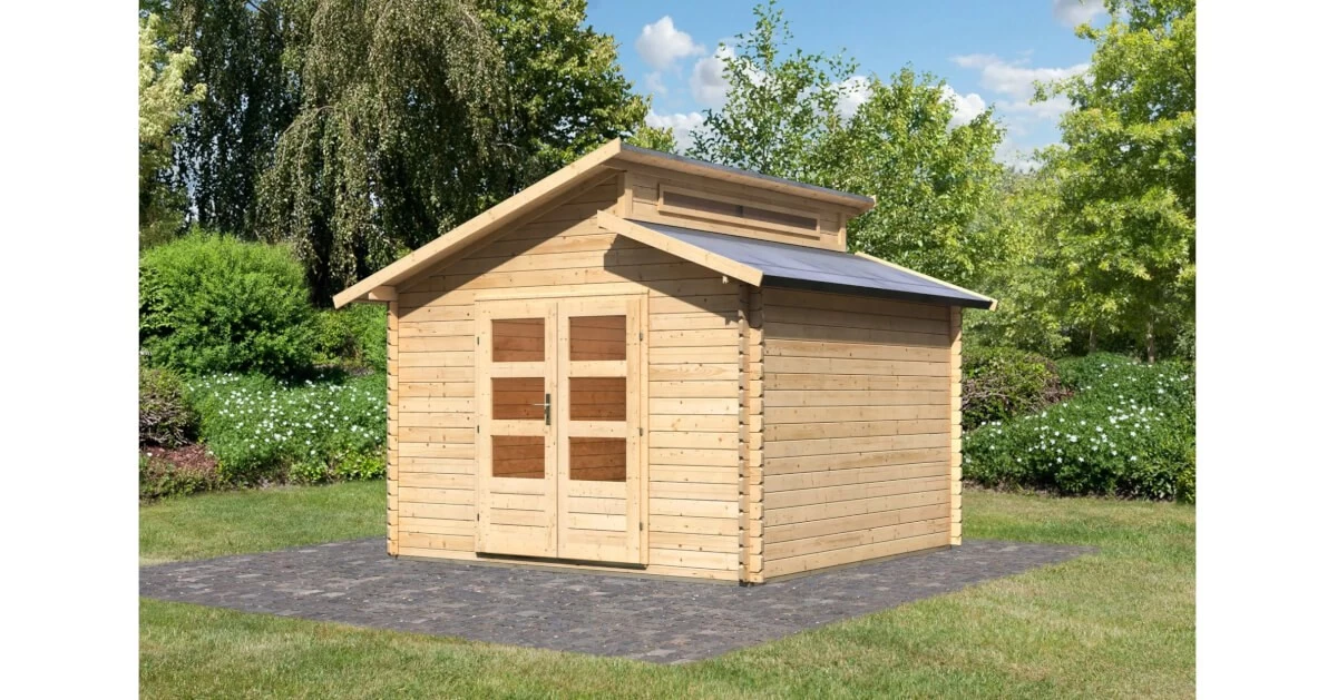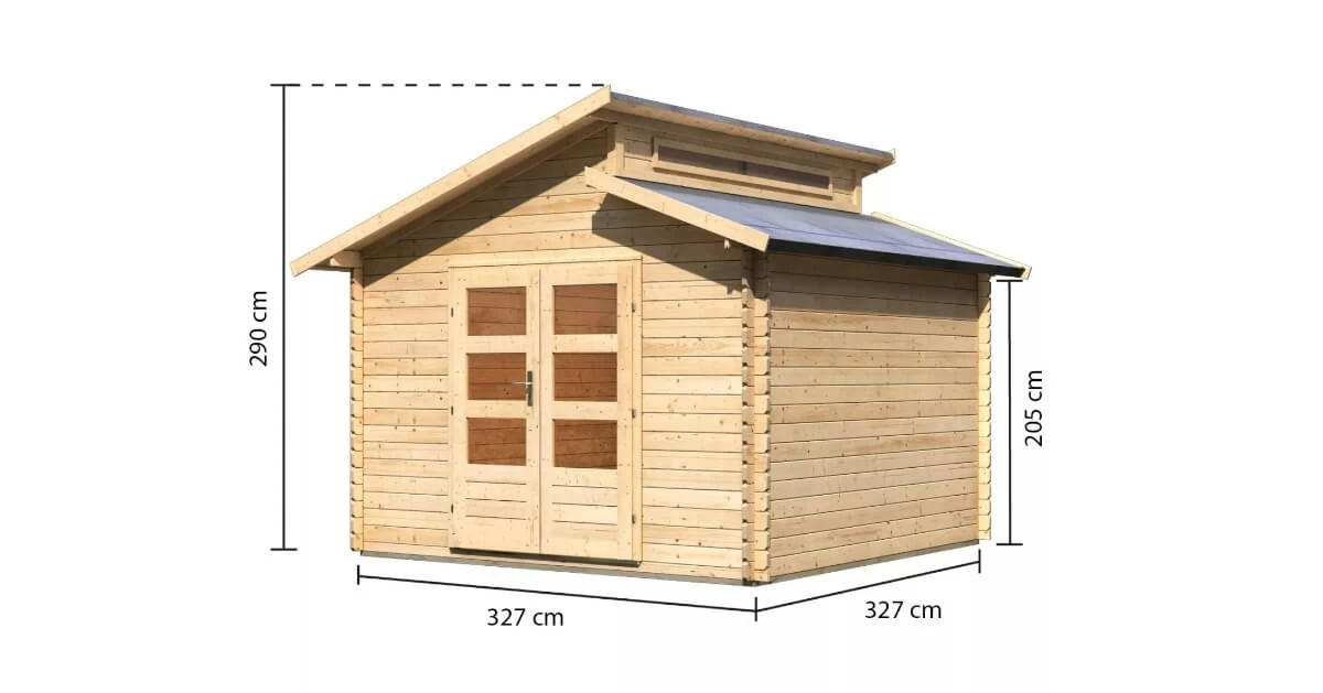 Das Haus hat eine Grundfläche von 10,7 m² und 22,3 m³ umbauten Raum. Dank der Seitenhöhe von 205 cm und einer Firsthöhe von 290 cm sorgt das Gerätehaus innen viel Platz. Das Gartenhaus hat ein Sockelmaß von 310 cm x 310 cm, mit den überstehenden Blockbohlenköpfen sind es 327 cm x 327 cm. Hier sind evtl. Kesseldruckimprägnierte Unterleger sorgen für optimalen Schutz gegen aufsteigende Feuchtigkeit. Durch die Positionierung unter dem Gartenhaus schützen die Bodenbalken effektiv vor Staunässe und Spritzwasser. Das Gartenhaus wird mit der vormontierten Tür im stabilen Massivholzrahmen ausgeliefert und bietet dank der großen Öffnung bequemen Zutritt in das Haus. Nebenbei bietet sie effektiven Schutz vor Diebstahl der Gegenstände, die sich im Haus befinden. Gleichzeitig lassen die großzügigen Lichtausschnitte im jeweiligen Türflügel viel Tageslicht in das Gartenhaus einströmen.