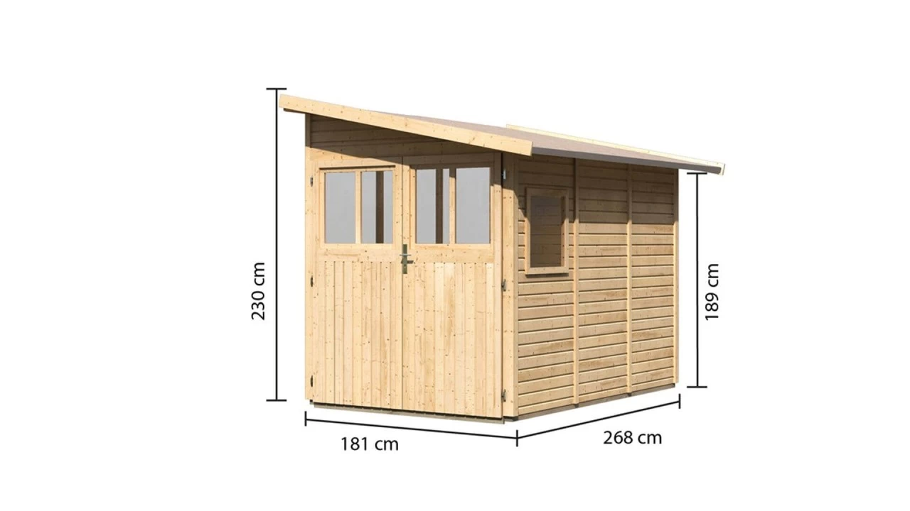 Das Gartenhaus Wandlitz 3 bietet für kleine Gärten die optimale Lösung. Da das 19 mm Gartenhaus an die Hauswand gestellt wird, verschenkt es keine Nutzfläche im Garten. Diese kann so zum Toben der kleinen oder für eine gemütliche Hollywoodschaukel verwendet werden. Verstauen Sie Ihre Gartengeräte wie den Rasenmäher, die Schubkarre oder die Gießkanne im Gartenhaus Wandlitz und schützen Sie diese vor der Witterung. Auch das Lagern der Gartenmöbel im Winter ist möglich. So bleibt Ihr Garten ordentlich und Sie können das Ambiente noch mehr genießen. Mit einer Außenmaßbreite von 181 cm passt es bestimmt auch neben Ihr Haus. Die Außenmaßtiefe von 268 cm bietet ausreichend Platz für Ihre Gegenstände. Durch die vier verschiedenen Größen lässt sich das Gartenhaus ideal auf Ihre Vorstellungen anpassen. Dies ermöglicht auch die Gestaltung einer kleinen Werkstatt im Außenbereich. Das Pultdachhaus mit einer Dachfläche von 6,8 m² und die Doppelflügeltür mit einem Lichtausschnitt je Türflügel runden die Optik ab. Ein feststehendes Fenster in der Seite sorgt für Tageslicht im Innenraum. Durch ein zusätzliches Türelement lässt sich das Haus von beiden Seiten betreten und kann so auch als Durchgang in den Garten dienen. Das Gartenhaus ist in Naturbelassen, Terragrau und Anthrazit erhältlich. Das Gartenhaus Wandlitz 3, eine smarte Alternative zum klassischen Gartenhaus.