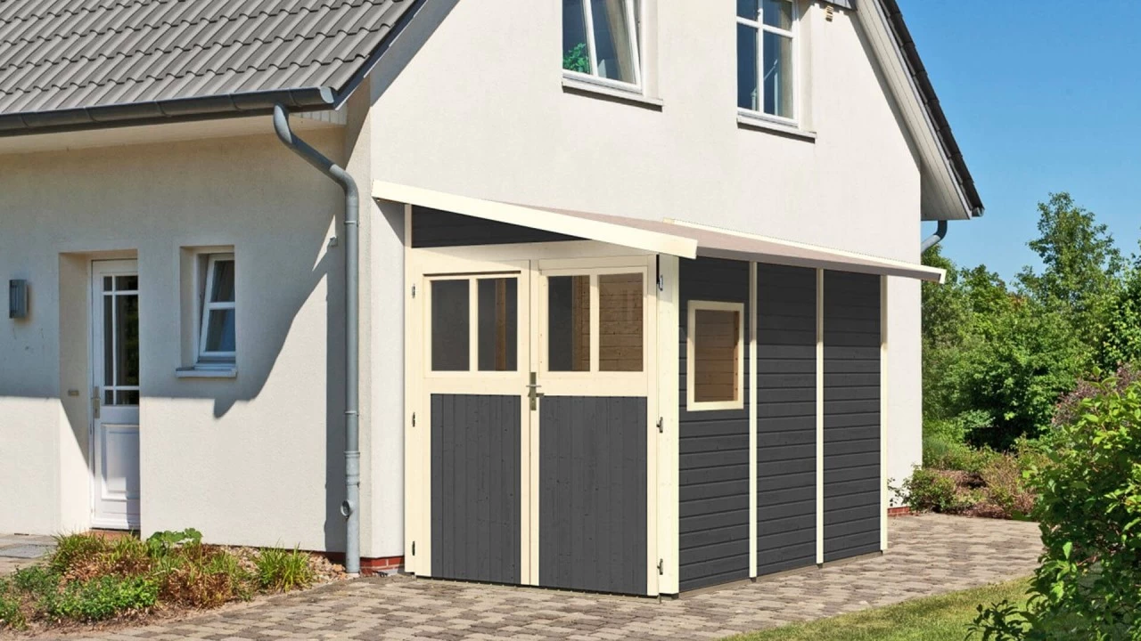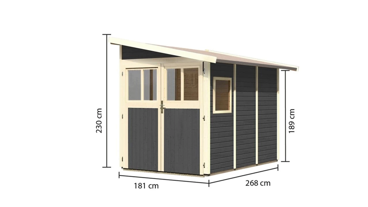 Das Gartenhaus Wandlitz 3 bietet für kleine Gärten die optimale Lösung. Da das 19 mm Gartenhaus an die Hauswand gestellt wird, verschenkt es keine Nutzfläche im Garten. Diese kann so zum Toben der kleinen oder für eine gemütliche Hollywoodschaukel verwendet werden. Verstauen Sie Ihre Gartengeräte wie den Rasenmäher, die Schubkarre oder die Gießkanne im Gartenhaus Wandlitz und schützen Sie diese vor der Witterung. Auch das Lagern der Gartenmöbel im Winter ist möglich. So bleibt Ihr Garten ordentlich und Sie können das Ambiente noch mehr genießen. Mit einer Außenmaßbreite von 181 cm passt es bestimmt auch neben Ihr Haus. Die Außenmaßtiefe von 268 cm bietet ausreichend Platz für Ihre Gegenstände. Durch die vier verschiedenen Größen lässt sich das Gartenhaus ideal auf Ihre Vorstellungen anpassen. Dies ermöglicht auch die Gestaltung einer kleinen Werkstatt im Außenbereich. Das Pultdachhaus mit einer Dachfläche von 6,8 m² und die Doppelflügeltür mit einem Lichtausschnitt je Türflügel runden die Optik ab. Ein feststehendes Fenster in der Seite sorgt für Tageslicht im Innenraum. Durch ein zusätzliches Türelement lässt sich das Haus von beiden Seiten betreten und kann so auch als Durchgang in den Garten dienen. Das Gartenhaus ist in Naturbelassen, Terragrau und Anthrazit erhältlich. Das Gartenhaus Wandlitz 3, eine smarte Alternative zum klassischen Gartenhaus.