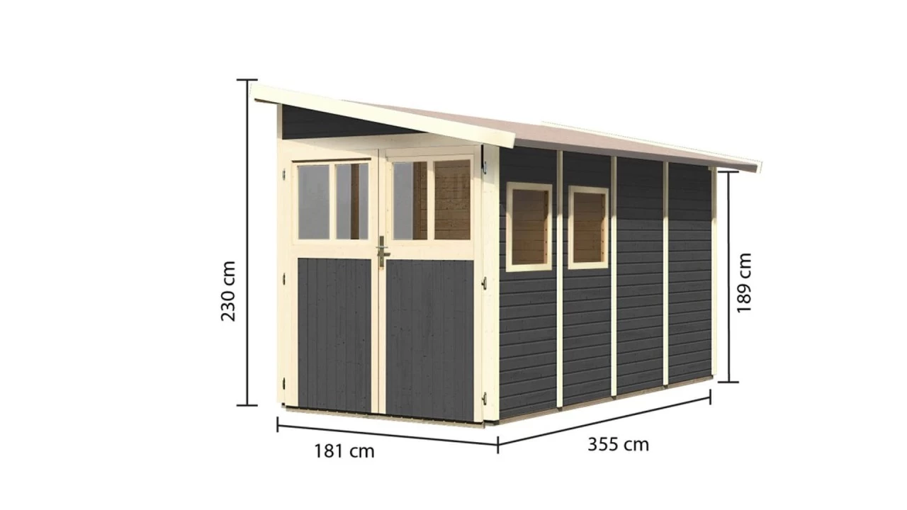 Mit einer Außenmaßbreite von 181 cm passt es bestimmt auch neben Ihr Haus. Die Außenmaßtiefe von 355 cm bietet ausreichend Platz für Ihre Gegenstände. Durch die vier verschiedenen Größen lässt sich das Gartenhaus ideal auf Ihre Vorstellungen anpassen. Dies ermöglicht auch die Gestaltung einer kleinen Werkstatt im Außenbereich. Das Pultdachhaus mit einer Dachfläche von 8,7 m² und die Doppelflügeltür mit einem Lichtausschnitt je Türflügel runden die Optik ab. Zwei feststehende Fenster in der Seite sorgen für Tageslicht im Innenraum. Durch ein zusätzliches Türelement lässt sich das Haus von beiden Seiten betreten und kann so auch als Durchgang in den Garten dienen. Das Gartenhaus ist in Naturbelassen, Terragrau und Anthrazit erhältlich. Das Gartenhaus Wandlitz 4, eine smarte Alternative zum klassischen Gartenhaus.