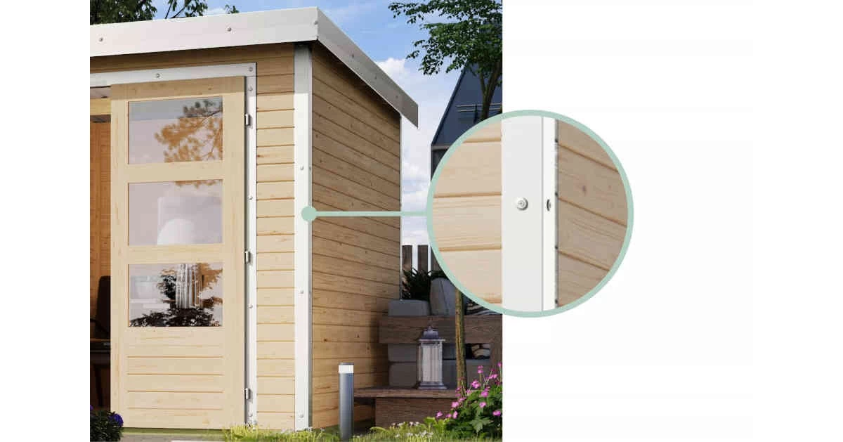Das Gartenhaus wird aus hochwertigen Materialien gefertigt: Die Wände bestehen aus nordischer Fichte, bekannt für ihre natürliche Schönheit und Robustheit. Stahlecken und ein Trapezblechdach verleihen dem Design einen modernen Touch.