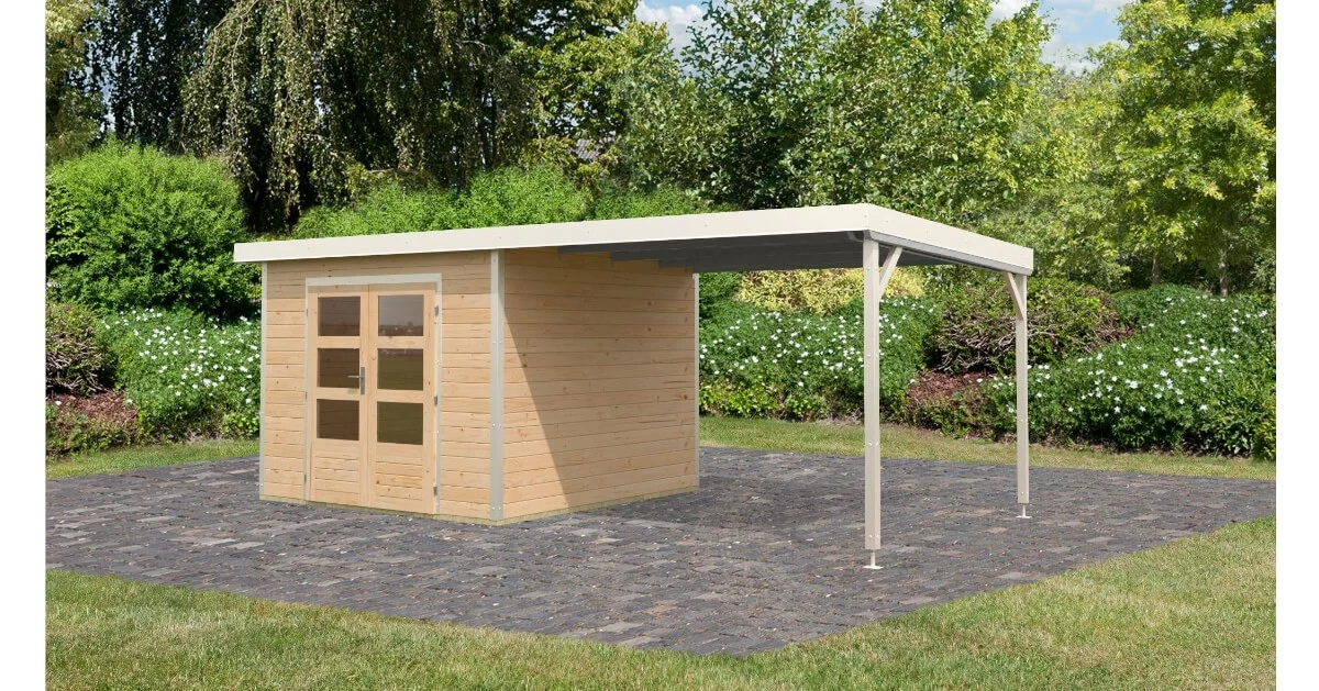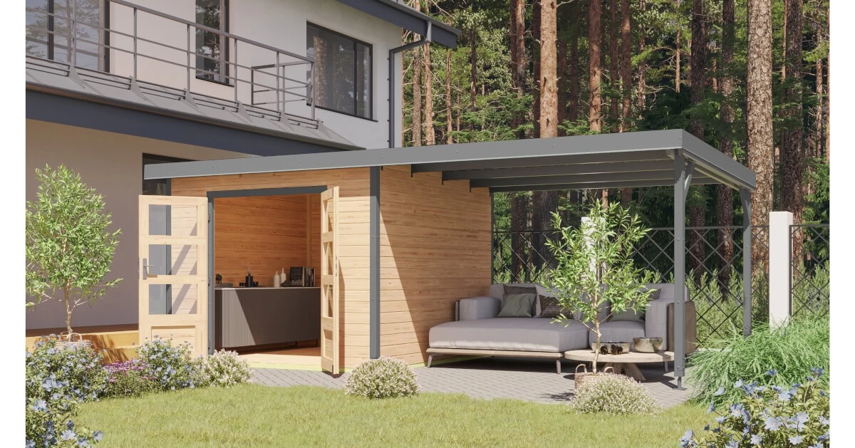Mit dem optionalen Anbaudach erhalten Sie zusätzlichen Stauraum und erweiterte Nutzungsmöglichkeiten als Gartenlounge. Machen Sie es zu Ihrem persönlichen Rückzugsort.