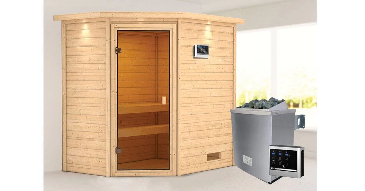 Karibu 38mm Massivholzsauna Jella mit 9kW Saunaofen mit ext. Steuerung Easy