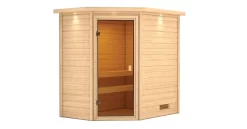 Was eignet sich für einen bislang ungenutzten Kellerraum besser, als eine eigene Sauna zum Entspannen und Wohlfühlen? Die Sauna Jella hat ein Außenmaß von 195 x 145 cm und ist, aufgrund seiner geringen Höhe von 187 cm, ideal auch für Räume mit einer niedrigen Deckenhöhe geeignet. Die Massivholzsauna besteht aus 38mm starken Wandbohlen aus nordischer Fichte, welche im einfachen Steck- und Schraubsystem montiert werden. Durch den Eckeinstieg und die besondere, fünfeckige Form, sorgt die Sauna für ein Highlight in Ihrer Wellness-Oase. Mit einem optional wählbaren Dachkranz inkl. 3 LED-Spots, können Sie die Sauna von außen beleuchten und sie so gekonnt in Szene setzen. In den Innenraum gelangen Sie durch eine bronzierte Ganzglastür aus Einscheibensicherheitsglas. Damit beim Saunieren keine Wärme entweichen kann, wird die Tür durch eine Magnetverschlusstechnik geschlossen gehalten. Auf den, im Lieferumfang enthaltenen, Saunaliegen können Sie den Saunagang so richtig genießen. Entspannen Sie nach einem stressigen Arbeitstag und schöpfen Sie neue Kraft aus der angenehmen Wärme auf Ihrer Haut. Heizen Sie den Innenraum mit einem optional erhältlichen, steckerfertigen 3,6kW Ofen. Dieser hat den Vorteil, dass er einfach an eine hausübliche 240Volt Steckdose angeschlossen werden kann und so keine Montage- oder Umbaukosten erfordert. Oder wählen Sie unseren klassischen Ofen. Dieser schafft, aufgrund der höheren Leistung, eine höhere maximale Temperatur. Beide Öfen sind in drei verschiedenen Varianten erhältlich. Nutzen Sie Ihren Kellerraum zur Entspannung und verwandeln Sie ihn in eine Wellness-Oase mit der Massivholzsauna Sauna Jella.