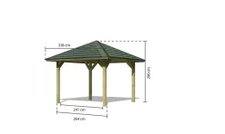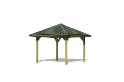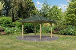 Pavillon Bergen 1 bietet, mit einem AuĂźenmaĂź von (BxT) 264,5×264,5cm, ausreichend Möglichkeiten. Nutzen Sie die gewonnene Fläche in Ihrem Garten fĂĽr eine gemĂĽtliche Sitzgruppe zum Entspannen. Richten Sie sich mit einem Tresen und ein paar Hockern eine gemĂĽtliche Bar ein. Oder nutzen Sie den Pavillon Bergen 1 als Unterstellmöglichkeit fĂĽr Ihren groĂźen Gartentisch zum Essen und Beisammensein. Das Dach mit einer Dachfläche von 12,8m² wird von vier 11,5×11,5 cm starken, kesseldruckimprägnierten Massivholzpfosten inkl. Querverbindern gestĂĽtzt. Einen angenehmen Stand ermöglicht eine Höhe von 290 cm. Erweitern Sie Ihren Pavillon Bergen 1 und machen Sie Ihn zu einem echten Highlight in Ihrem Garten mit einer BrĂĽstung und dem passenden FuĂźboden. Abrunden können Sie das Gesamtbild mit unseren optional erhältlichen Dachschindeln. GeschĂĽtzt wird das Holz des Pavillons durch ein kesseldruckimprägnierende Verfahren. Hierbei werden mithilfe von Druck chemische Salze in das Holz gepresst und es wird somit vor der Witterung geschĂĽtzt. So wird der Pavillon zu einem treuen Begleiter in Ihrem Garten und wird mit Ihnen bestimmt viele Geburtstage, Grillabende und entspannte Sommertage erleben. Kreieren Sie Ihren eigenen zusätzlichen Platz im Garten mit dem Pavillon Bergen 1.