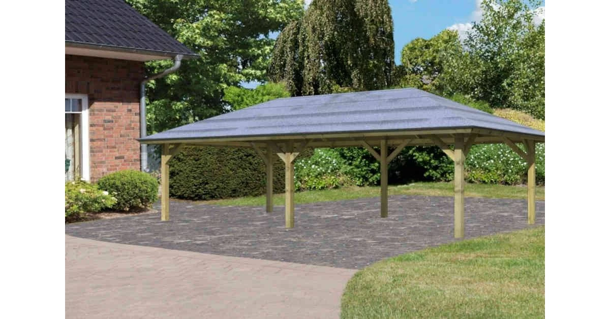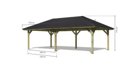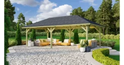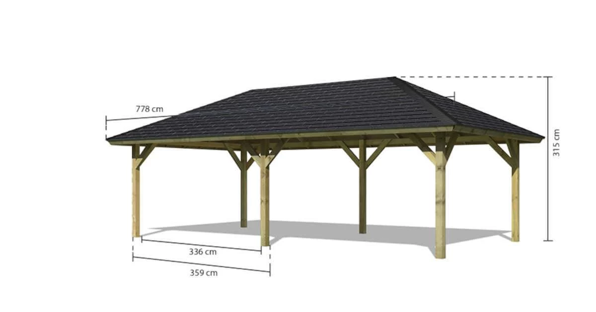 Viel Platz für Ihre Wohlfühloase bietet Ihnen der Pavillon Holm 2. Mit einem Außenmaß von (BxT) 706,5x359cm erhalten Sie im eigenen Garten genügend zusätzlichen Platz. Diesen können Sie nutzen, um sich eine gemütliche Sitzecke zum Entspannen nach einem stressigen Arbeitstag einzurichten. Auch als Unterstand für Tischkicker, eine Tischtennisplatte oder ähnliches eignet sich der Pavillon Holm 2 ideal. Geschützt wird das Holz durch ein Holzschutzverfahren, bei dem durch Druck chemische Salze in das Holz gepresst werden. Somit wird es vor der Witterung und vor Schädlingen geschützt. Dadurch wird Ihnen der Pavillon lange erhalten bleiben und ist aus Ihrem Garten nicht mehr wegzudenken. Das Dach mit einer Dachfläche von 37,6m² können Sie mit unseren optional erhältlichen Dachschindeln schützen. Nachdem der Garten auf Vordermann gebracht wurde können Sie diesen nun in vollen Zügen genießen. Lauschen Sie dem Rauschen der Bäume, beobachten Sie die kleinen Vögel, wie sie Ihre Nester bauen oder entspannen Sie bei einem guten Buch und einem leckeren Getränk. Sollte das Wetter mal umschlagen, müssen Sie Ihren Tag im Garten nicht sofort beenden. Bei einem warmen Sommerregen können Sie, geschützt unter dem Pavillon, Ihr Buch oder den Grillabend trocken beenden. Schaffen Sie sich ein Highlight in Ihrem Garten mit dem Pavillon Holm 2.
