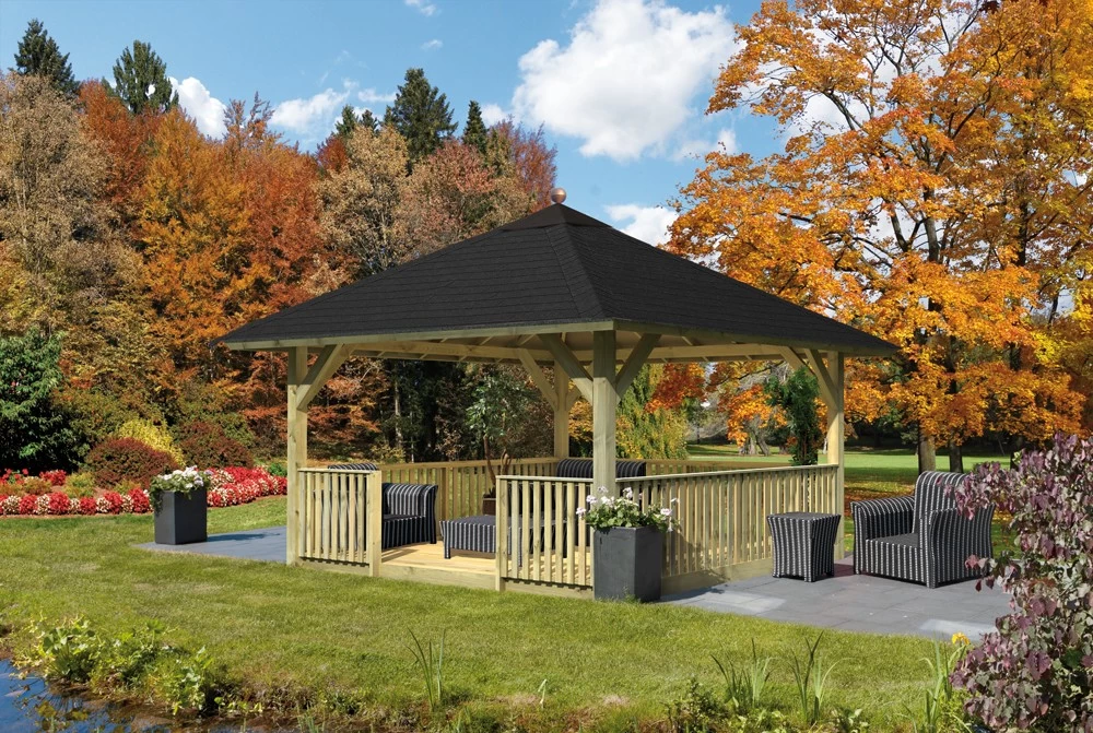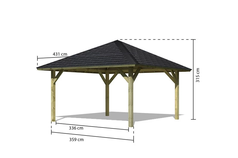 Viel Platz für Ihre Wohlfühloase bietet Ihnen der Pavillon Holm 1. Mit einem Außenmaß von (BxT) 359x359cm erhalten Sie im eigenen Garten genügend zusätzlichen Platz. Diesen können Sie nutzen, um sich eine gemütliche Sitzecke zum Entspannen nach einem stressigen Arbeitstag einzurichten. Auch als Unterstand für Tischkicker, eine Tischtennisplatte oder ähnliches eignet sich der Pavillon Holm 1 ideal. Geschützt wird das Holz durch ein Holzschutzverfahren, bei dem durch Druck chemische Salze in das Holz gepresst werden. Somit wird es vor der Witterung und vor Schädlingen geschützt. Dadurch wird Ihnen der Pavillon lange erhalten bleiben und ist aus Ihrem Garten nicht mehr wegzudenken. Das Dach mit einer Dachfläche von 20,8m² können Sie mit unseren optional erhältlichen Dachschindeln schützen. Nachdem der Garten auf Vordermann gebracht wurde können Sie diesen nun in vollen Zügen genießen. Lauschen Sie dem Rauschen der Bäume, beobachten Sie die kleinen Vögel, wie sie Ihre Nester bauen oder entspannen Sie bei einem guten Buch und einem leckeren Getränk. Sollte das Wetter mal umschlagen, müssen Sie Ihren Tag im Garten nicht sofort beenden. Bei einem warmen Sommerregen können Sie, geschützt unter dem Pavillon, Ihr Buch oder den Grillabend trocken beenden. Schaffen Sie sich ein Highlight in Ihrem Garten mit dem Pavillon Holm 1.