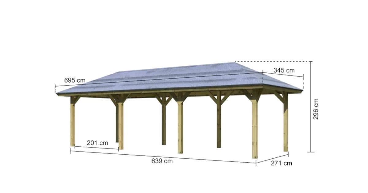 Mit einem Außenmaß von (BxT) 289x639cm bietet er genügend Platz für eine gemütliche Sitzgruppe, einen Tischkicker oder einer Tischtennisplatte im eigenen Garten. Das Dach mit einer Dachfläche von 27m² wird von acht 9x9cm starken kesseldruckimprägnierten Massivholzpfosten getragen. Schaffen Sie sich einen gemütlichen Ort im Garten, der zum Entspannen, Wohlfühlen und Beisammensein einlädt. Auch an einem grauen Sommertag müssen Sie nun die Zeit nicht im Haus verbringen. Lauschen Sie dem Prasseln des Sommerregens, genießen Sie ein leckeres Frühstück im Garten unter dem schützenden Dach oder veranstalten Sie eine kleine Grillparty.