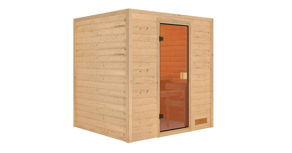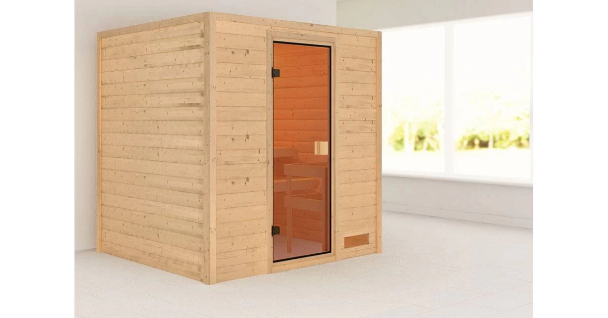 Was eignet sich für einen bislang ungenutzten Kellerraum besser, als eine eigene Sauna zum Entspannen und Wohlfühlen? Die Sauna Adelina hat ein Außenmaß von 195 x 169 cm und ist, aufgrund seiner geringen Höhe von 187 cm, ideal auch für Räume mit einer niedrigen Deckenhöhe geeignet. Die Massivholzsauna besteht aus 38mm starken Wandbohlen aus nordischer Fichte, welche im einfachen Steck- und Schraubsystem montiert werden. Durch den Fronteinstieg und die schlichte, rechteckige Form passt sie sich jeder Umgebung mühelos an. Mit einem optional wählbaren Dachkranz inkl. 3 LED-Spots, können Sie die Sauna von außen beleuchten und sie so gekonnt in Szene setzen. In den Innenraum gelangen Sie durch eine bronzierte Ganzglastür aus Einscheibensicherheitsglas. Damit beim Saunieren keine Wärme entweichen kann, wird die Tür durch eine Magnetverschlusstechnik geschlossen gehalten. Auf den, im Lieferumfang enthaltenen, Liegen können Sie den Saunagang so richtig genießen. Verschönern Sie das Ambiente in Ihrer Sauna und sorgen Sie für die größtmögliche Erholung mit unserem optional erhältlichen Zubehör. Eine Saunalampe Classic in der Ecke, eine ergonomische Kopfstütze für die perfekte Liegeposition oder eine Salzkristall Vital Sole für freies Atmen macht Ihren Saunagang zu einem perfekten Erlebnis. Entspannen Sie nach einem stressigen Arbeitstag und schöpfen Sie neue Kraft aus der angenehmen Wärme auf Ihrer Haut. Heizen Sie den Innenraum mit einem optional erhältlichen, klassischen 4,5kW-Ofen. Dieser sorgt aufgrund seiner höheren Leistung für höhere Temperaturen und für ein angenehmes Klima im Innenraum. Der Saunaofen ist in einer Variante mit integrierter Steuerung, einer mit externer Steuerung und als Bio-Kombiofen erhältlich. Nutzen Sie Ihren Kellerraum zur Entspannung und verwandeln Sie ihn in eine Wellness-Oase mit der Massivholzsauna Sauna Adelina.