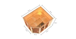 Genau die Entspannung, die Sie sich wünschen. Ein heller und geräumiger Innenraum, der keine Wünsche offen lässt. Nutzen Sie die warme und beruhigende Saunaluft und stärken Sie Ihr Herz-Kreislauf-System. Fördern Sie die Durchblutung der Schleimhäute und fördern so die Heilung von Atemwegsinfekten. Mit der Systemsauna Ainur tun Sie gleichzeitig etwas für Körper und Seele. Ausgestattet mit einem 9kW-Saunaofen, drei Saunaliegen aus weichem Espenholz, Bankblenden und Rückenlehnen, einem Ofenschutzgitter-Premium und einer Kopfstütze bringt die Sauna bereits alles mit, was Ihr Herz begehrt. Nach einem langen und harten Arbeitstag im Büro möchte sich jeder Entspannung und das so effektiv wie möglich. Dies gelingt nun kinderleicht mit einem ausgiebigen Saunabad. Im Nu sind Ihre Muskeln entspannt und der Alltagsstress vergessen. Mit den Außenmaßen 231 x 196 x 198 cm (B/T/H) ohne Dachkranz bietet die Sauna genug Platz für Sie und Ihre Liebsten. Genießen Sie die Möglichkeiten alleine oder mit der ganzen Familie. Die Saunabänke verfügen über eine Breite von 57 cm und ermöglichen so ein angenehmes Liegen während des Saunierens. Bei dem Ofen können Sie zwischen einem 9kW-Ofen mit integrierter Steuerung oder einem Ofen mit externerer Steuerung „Easy“ wählen. Oder Sie entscheiden sich für einen 9kW-Bio-Kombiofen mit externer Steuerung „Easy“. Der Bio-Kombiofen verfügt, neben der klassischen finnischen Sauna, auch über eine Verdampfer-Einheit. Dies ermöglicht auch eine Kräuterdampf-Kur, ein Soft-Dampfbad-Feuchtwarm und eine Familiensauna. So ist garantiert für jeden das Richtige dabei. Ein echtes Highlight bieten die vier großzügigen Fenster in der Sauna. Diese lassen viel Tageslicht in das Innere und sorgen durch das bronzierte Glas für ein schönes Ambiente. Betreten können Sie die Sauna durch eine bronzierte Ganzglastür aus Einscheibensicherheitsglas mit Karibu-Türgriff. Die Wandelemente bestehen aus einer 68mm Rahmenkonstruktion mit Mineralwolldämmung und nordischen Fichtenbrettern. Machen Sie die Systemsauna unserer Superior-Reihe Ainur zu Ihrem ganz persönlichen Highlight in Ihrer Wellness-Oase.