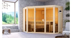 Genau die Entspannung, die Sie sich wünschen. Ein heller und geräumiger Innenraum, der keine Wünsche offen lässt. Nutzen Sie die warme und beruhigende Saunaluft und stärken Sie Ihr Herz-Kreislauf-System. Fördern Sie die Durchblutung der Schleimhäute und fördern so die Heilung von Atemwegsinfekten. Mit der Systemsauna Alcinda tun Sie gleichzeitig etwas für Körper und Seele. Ausgestattet mit einem 9kW-Saunaofen, drei Saunaliegen aus weichem Espenholz, Bankblenden und Rückenlehnen, einem Ofenschutzgitter-Premium und einer Kopfstütze bringt die Sauna bereits alles mit, was Ihr Herz begehrt. Nach einem langen und harten Arbeitstag im Büro möchte sich jeder Entspannung und das so effektiv wie möglich. Dies gelingt nun kinderleicht mit einem ausgiebigen Saunabad. Im Nu sind Ihre Muskeln entspannt und der Alltagsstress vergessen. Mit den Außenmaßen 231 x 231 x 198 cm (B/T/H) ohne Dachkranz bietet die Sauna genug Platz für Sie und Ihre Liebsten. Genießen Sie die Möglichkeiten alleine oder mit der ganzen Familie. Die Saunabänke verfügen über eine Breite von 57 cm und ermöglichen so ein angenehmes Liegen während des Saunierens. Bei dem Ofen können Sie zwischen einem 9kW-Ofen mit integrierter Steuerung oder einem Ofen mit externerer Steuerung „Easy“ wählen. Oder Sie entscheiden sich für einen 9kW-Bio-Kombiofen mit externer Steuerung „Easy“. Der Bio-Kombiofen verfügt, neben der klassischen finnischen Sauna, auch über eine Verdampfer-Einheit. Dies ermöglicht auch eine Kräuterdampf-Kur, ein Soft-Dampfbad-Feuchtwarm und eine Familiensauna. So ist garantiert für jeden das Richtige dabei. Ein echtes Highlight bieten die vier großzügigen Fenster in der Sauna. Diese lassen viel Tageslicht in das Innere und sorgen durch das bronzierte Glas für ein schönes Ambiente. Betreten können Sie die Sauna durch eine bronzierte Ganzglastür aus Einscheibensicherheitsglas mit Karibu-Türgriff. Die Wandelemente bestehen aus einer 68mm Rahmenkonstruktion mit Mineralwolldämmung und nordischen Fichtenbrettern. Machen Sie die Systemsauna unserer Superior-Reihe Alcinda zu Ihrem ganz persönlichen Highlight in Ihrer Wellness-Oase.