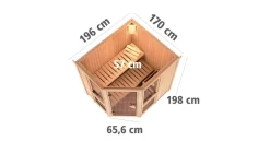 Großzügige, bronzierte Fenster inkl. einer Holzblende, 2 Saunabänke aus Espenholz und ein moderner Eckeinstieg machen das Saunaerlebnis mit der Systemsauna Amelia 1 perfekt .Eine 68mm starke Konstruktion, bestehend aus einer Rahmenkonstruktion mit 42mm starker Mineraldämmwolle und einer Verkleidung an der Sichtseite aus 12,5mm Spezial-Softline-Profilholz, hält die Wärme optimal im Saunainneren. Die Decke besteht aus einer 57mm starken Spezialplatte mit Mineraldämmwolle. Die Außenmaße betragen 196 x 170 x 198cm (B/T/H). Die Sauna lädt mit seiner hochwertigen Inneneinrichtung aus Espe zum Entspannen und Wohlfühlen ein. Mit einem optional erhältlichen 9kW-Saunaofen bringen Sie das Innere Ihrer Sauna schnell auf Temperatur. Bei dem Ofen können Sie zwischen einer Variante mit integrierter Steuerung, einer Variante mit externer Steuerung oder einem 9kW Bio-Kombi-Ofen wählen. So ist garantiert für jeden das Richtige dabei. Durch einen optionalen Dachkranz inkl. drei LED-Spots können Sie Ihre Sauna von außen beleuchten und sie so perfekt in Szene setzen. In den Innenraum gelangen Sie durch eine bronzierte Ganzglastür aus Einscheibensicherheitsglas mit Karibu-Türgriff. Um einen hellen Innenraum mit schönem Ambiente zu schaffen, verfügt die Sauna Amelia 1 über zwei großzügige bronzierte Fenster. Diese sorgen, neben einer warmen Atmosphäre im Innenraum, auch für ein echtes Highlight in Ihrer Wellness-Oase. Durch die vorgefertigten Wand und Deckenelemente wird Ihnen ein einfacher Aufbau ermöglicht. Passen Sie die Sauna auf Ihre Bedürfnisse an mit unserem optional erhältlichen Zubehör. Eine ergonomische Kopfstütze für den optimalen Liegekomfort, eine ergonomische Rückenlehne zur perfekten Entspannung oder eine Saunaleuchte modern für das richtige Licht im Inneren. Genießen Sie die Ruhe nach einem anstrengenden Arbeitstag bei einem ausgiebigen Saunagang und erholen Sie sich vom Alltag. Kreieren Sie sich Ihren eigenen Ort der Erholung und entspannen Sie vom Alltagsstress mit der Systemsauna.