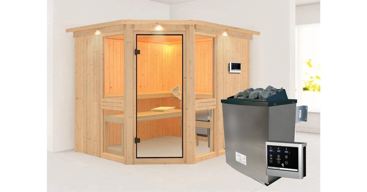 Karibu 68mm Systemsauna Amelia 3 mit Dachkranz + 9kW Saunaofen mit externer Steuerung