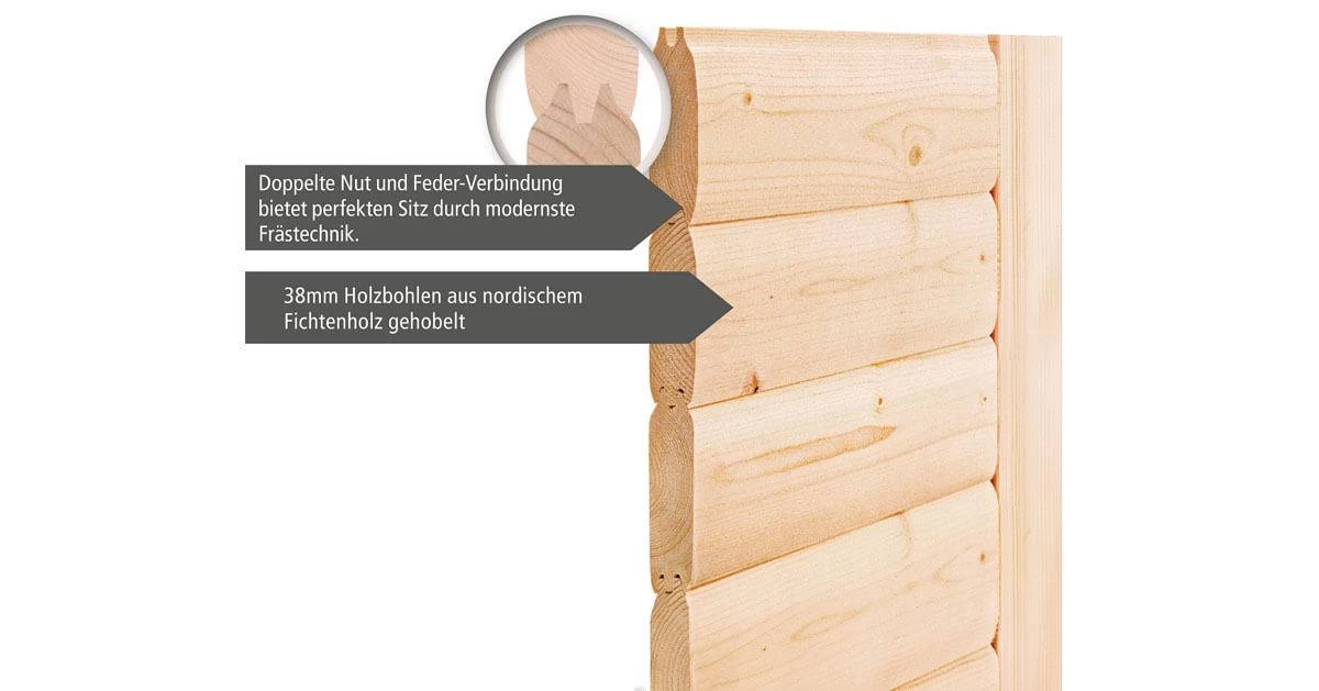 Karibu 38mm Massivholzsauna Anja mit 9kW Saunaofen (externe Steuerung)
