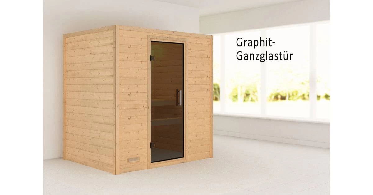 Rundum Massiv – mit der Massivholz-Sauna Anja schaffen Sie sich einen Ort der Ruhe und Entspannung in den eigenen vier Wänden. Die stabile Konstruktion mit 38mm Bohlen aus nordischem Fichtenholz wird im einfachen Steck-/ Schraubsystem montiert. Ein optional wählbarer Dachkranz inkl. 3 LED-Spots setzt die Sauna gekonnt in Szene. Wählen Sie eine der vier Türvarianten und passen Sie Ihre Sauna Ihren Vorstellungen optimal an. Ob energiesparend mit einer Holztür mit Isolierglas, klassisch mit einer bronzierten Ganzglastür, modern mit einer Ganzglastür in graphitfarben oder schlicht mit einer Klarglas Ganzglastür. Hier ist garantiert das Richtige für Sie dabei. Mit einem Außenmaß von 196 x 170 x 198 cm (B/T/H) besitzt die Sauna Anja die ideale Größe zum Entspannen und Wohlfühlen. Erweitern Sie Ihre Möglichkeiten mit dem optional erhältlichen Bio-Kombiofen. Neben einer klassischen finnischen Sauna haben Sie hier die Möglichkeit einer Kräuterdampf-Kur, einem Dampfbad und einer Familiensauna. So wird es zu einem Saunaerlebnis für die ganze Familie. Lassen Sie sich von der wohltuenden Wirkung des Saunabadens überzeugen. Bei regelmäßiger Anwendung fühlen Sie sich nicht nur deutlich entspannter. Zusätzlich wirkt es sich positiv auf den Stoffwechsel aus, Reinig unsere Haut und entspannt die Muskulatur. Mit einer optional erhältlichen Salzkristall Vital Sole oder der Salzkristall-Leuchte können Sie Ihre Atemwege befreien und wieder tief ein- und ausatmen. Genießen Sie die zahlreichen Vorteile des Saunieren und schaffe Sie einen Ort der Ruhe mit der Massivholz-Sauna Anja.
