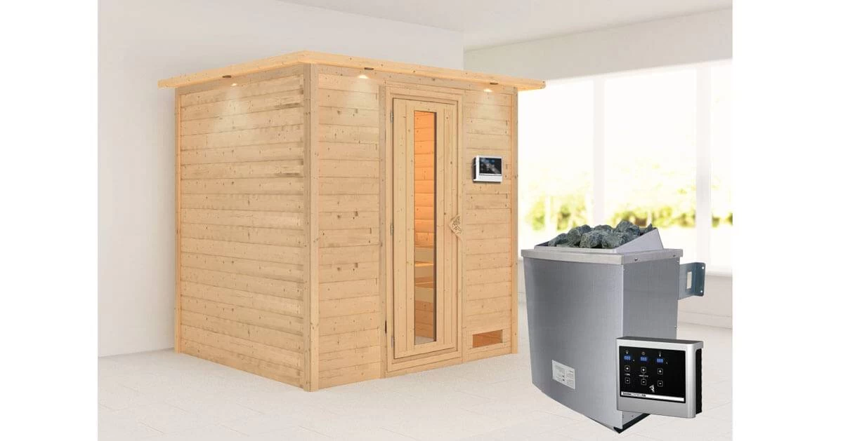 Karibu 38mm Massivholzsauna Anja mit Dachkranz + 9kW Saunaofen (externe Steuerung)