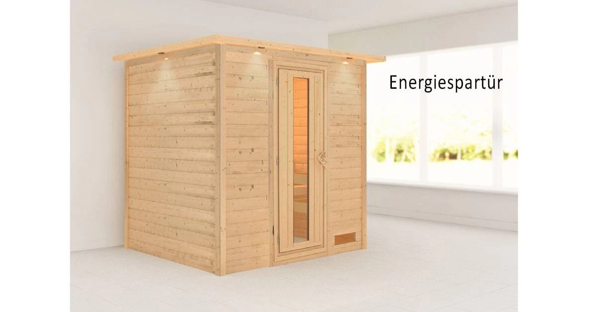 Rundum Massiv – mit der Massivholz-Sauna Anja schaffen Sie sich einen Ort der Ruhe und Entspannung in den eigenen vier Wänden. Die stabile Konstruktion mit 38mm Bohlen aus nordischem Fichtenholz wird im einfachen Steck-/ Schraubsystem montiert. Ein optional wählbarer Dachkranz inkl. 3 LED-Spots setzt die Sauna gekonnt in Szene. Wählen Sie eine der vier Türvarianten und passen Sie Ihre Sauna Ihren Vorstellungen optimal an. Ob energiesparend mit einer Holztür mit Isolierglas, klassisch mit einer bronzierten Ganzglastür, modern mit einer Ganzglastür in graphitfarben oder schlicht mit einer Klarglas Ganzglastür. Hier ist garantiert das Richtige für Sie dabei. Mit einem Außenmaß von 196 x 170 x 198 cm (B/T/H) besitzt die Sauna Anja die ideale Größe zum Entspannen und Wohlfühlen. Erweitern Sie Ihre Möglichkeiten mit dem optional erhältlichen Bio-Kombiofen. Neben einer klassischen finnischen Sauna haben Sie hier die Möglichkeit einer Kräuterdampf-Kur, einem Dampfbad und einer Familiensauna. So wird es zu einem Saunaerlebnis für die ganze Familie. Lassen Sie sich von der wohltuenden Wirkung des Saunabadens überzeugen. Bei regelmäßiger Anwendung fühlen Sie sich nicht nur deutlich entspannter. Zusätzlich wirkt es sich positiv auf den Stoffwechsel aus, Reinig unsere Haut und entspannt die Muskulatur. Mit einer optional erhältlichen Salzkristall Vital Sole oder der Salzkristall-Leuchte können Sie Ihre Atemwege befreien und wieder tief ein- und ausatmen. Genießen Sie die zahlreichen Vorteile des Saunieren und schaffe Sie einen Ort der Ruhe mit der Massivholz-Sauna Anja.