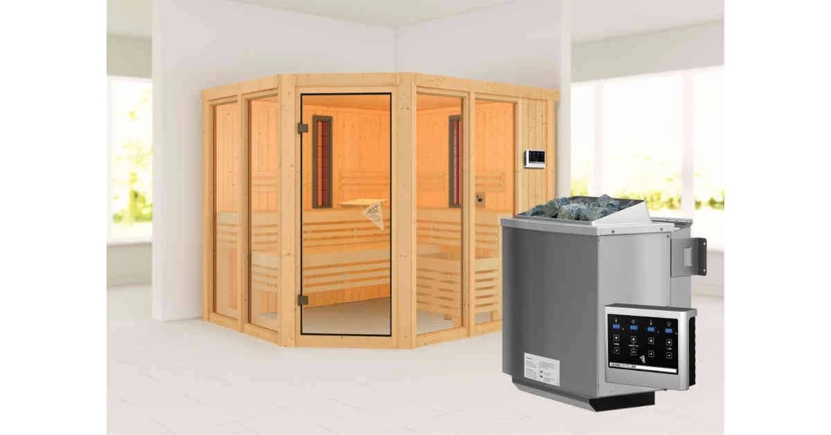 Genau die Entspannung, die Sie sich wünschen. Die Sauna-Infrarot-Kombination Ava lässt ist eine Sauna, die keine Wünsche mehr offen lässt. Nutzen Sie die warme und beruhigende Saunaluft und stärken Sie Ihr Herz-Kreislauf-System oder nutzen Sie die Tiefenwirkung der Infrarotstrahler bei Muskelbeschwerden und Verspannungen. Mit der Multifunktionssauna … sind Sie auf alles vorbereitet. Ausgestattet mit einem 9kW-Saunaofen, zwei Infrarotstrahlern, drei Saunaliegen aus weichem Espenholz, Bankblenden und Rückenlehnen, einem Ofenschutzgitter-Premium und einer Kopfstütze bringt die Sauna bereits alles mit, was Ihr Herz begehrt. Nach einem langen und harten Arbeitstag im Büro passiert es schnell, dass sich Ihr Rücken verspannt. Nun zur Erholung schnell in die Sauna und die Infrarot-Strahler angeschaltet. Im Nu sind Ihre Muskeln entspannt und Ihre Beschwerden gelindert. Mit einem Außenmaß von Ihrer Wellness-Oase.196 x 231 x 202 cm (B/T/H) ohne Dachkranz bietet die Sauna genug Platz. Genießen Sie die Möglichkeiten alleine oder mit der ganzen Familie. Die Saunabänke verfügen über eine Breite von 57 cm und ermöglichen so ein angenehmes Liegen. Bei dem Ofen können Sie zwischen einem 9kW-Ofen mit externer Steuerung oder einem 9kW-Bio-Kombiofen mit externer Steuerung wählen. Der Bio-Kombiofen verfügt, neben der klassischen finnischen Sauna, auch über eine Verdampfereinheit. Dies ermöglicht auch eine Kräuterdampf-Kur, ein Soft-Dampfbad-Feuchtwarm und eine Familiensauna. So ist garantiert für jeden das Richtige dabei. Ein echtes Highlight bieten die vier großzügigen Fenster in der Sauna. Diese lassen viel Tageslicht in das Innere und sorgen durch das bronzierte Glas für ein schönes Ambiente. Betreten können Sie die Sauna durch eine bronzierte Ganzglastür aus Einscheibensicherheitsglas mit Karibu-Türgriff. Die Wandelemente bestehen aus einer 68mm Rahmenkonstruktion mit Mineralwolldämmung und nordischen Fichtenbrettern. Machen Sie die Multifunktionssauna Ava zu Ihrem ganz persönlichen Highlight in