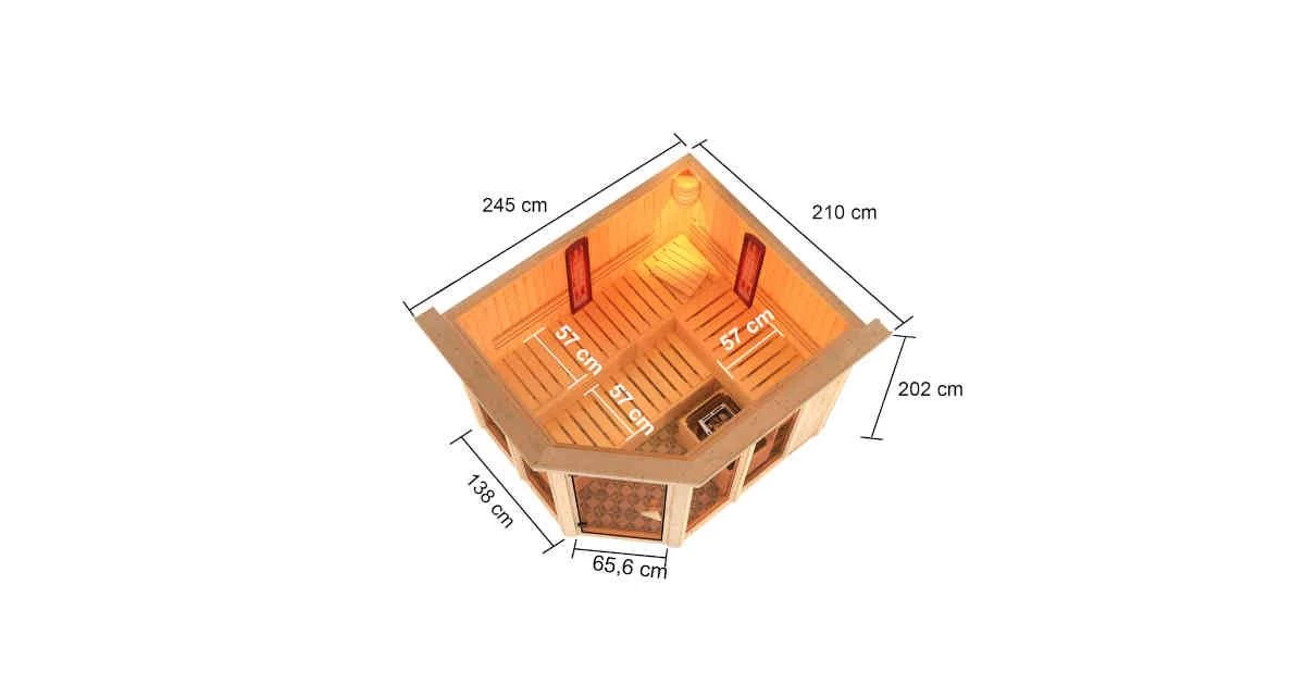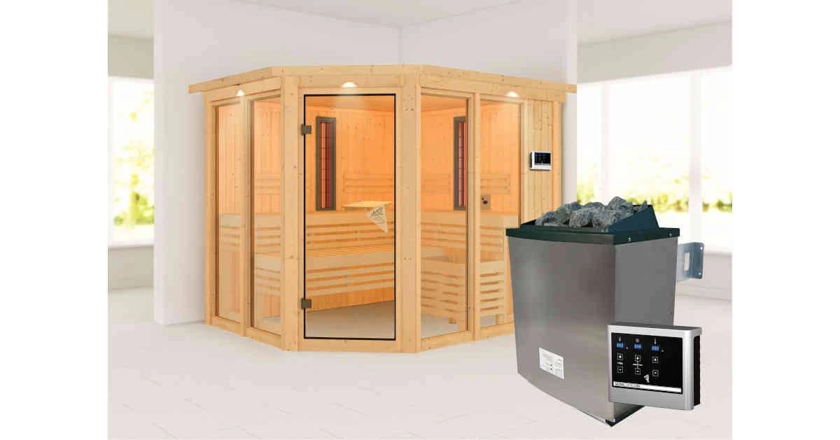 Genau die Entspannung, die Sie sich wünschen. Die Sauna-Infrarot-Kombination Ava lässt ist eine Sauna, die keine Wünsche mehr offen lässt. Nutzen Sie die warme und beruhigende Saunaluft und stärken Sie Ihr Herz-Kreislauf-System oder nutzen Sie die Tiefenwirkung der Infrarotstrahler bei Muskelbeschwerden und Verspannungen. Mit der Multifunktionssauna … sind Sie auf alles vorbereitet. Ausgestattet mit einem 9kW-Saunaofen, zwei Infrarotstrahlern, drei Saunaliegen aus weichem Espenholz, Bankblenden und Rückenlehnen, einem Ofenschutzgitter-Premium und einer Kopfstütze bringt die Sauna bereits alles mit, was Ihr Herz begehrt. Nach einem langen und harten Arbeitstag im Büro passiert es schnell, dass sich Ihr Rücken verspannt. Nun zur Erholung schnell in die Sauna und die Infrarot-Strahler angeschaltet. Im Nu sind Ihre Muskeln entspannt und Ihre Beschwerden gelindert. Mit einem Außenmaß von Ihrer Wellness-Oase.196 x 231 x 202 cm (B/T/H) ohne Dachkranz bietet die Sauna genug Platz. Genießen Sie die Möglichkeiten alleine oder mit der ganzen Familie. Die Saunabänke verfügen über eine Breite von 57 cm und ermöglichen so ein angenehmes Liegen. Bei dem Ofen können Sie zwischen einem 9kW-Ofen mit externer Steuerung oder einem 9kW-Bio-Kombiofen mit externer Steuerung wählen. Der Bio-Kombiofen verfügt, neben der klassischen finnischen Sauna, auch über eine Verdampfereinheit. Dies ermöglicht auch eine Kräuterdampf-Kur, ein Soft-Dampfbad-Feuchtwarm und eine Familiensauna. So ist garantiert für jeden das Richtige dabei. Ein echtes Highlight bieten die vier großzügigen Fenster in der Sauna. Diese lassen viel Tageslicht in das Innere und sorgen durch das bronzierte Glas für ein schönes Ambiente. Betreten können Sie die Sauna durch eine bronzierte Ganzglastür aus Einscheibensicherheitsglas mit Karibu-Türgriff. Die Wandelemente bestehen aus einer 68mm Rahmenkonstruktion mit Mineralwolldämmung und nordischen Fichtenbrettern. Machen Sie die Multifunktionssauna Ava zu Ihrem ganz persönlichen Highlight in