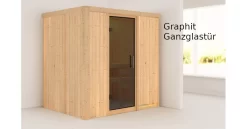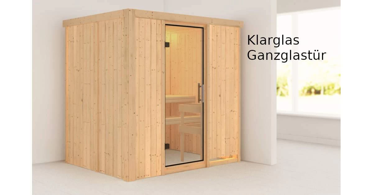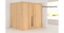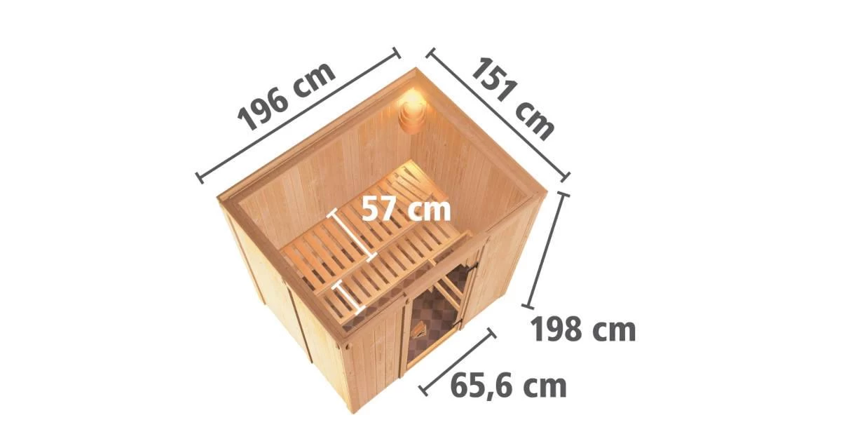 Sparen Sie wertvolle Energie mit der Systemsauna Bodin. Eine 68mm starke Konstruktion, bestehend aus einer Rahmenkonstruktion mit 42mm starker Mineraldämmwolle und einer Verkleidung an der Sichtseite aus 12,5mm Spezial-Softline-Profilholz, hält die Wärme optimal im Saunainneren. Die Decke besteht aus einer 57mm starken Spezialplatte mit Mineraldämmwolle. Die Außenmaße ohne Dachkranz betragen 196 x 151 x 198cm (B/T/H). Die Sauna verfügt über 2 Saunabänke aus Espenholz zum Entspannen und Wohlfühlen. Mit einem optional erhältlichen 4,5kW-Saunaofen bringen Sie das Innere schnell auf Temperatur. Bei dem Ofen können Sie zwischen einer Variante mit integrierter Steuerung, einer Variante mit externer Steuerung oder einem 4,5kW Bio-Kombiofen wählen. So ist garantiert für jeden das Richtige dabei. Durch einen optionalen Dachkranz inkl. drei LED-Spots können Sie Ihre Sauna von außen beleuchten und sie so perfekt in Szene setzen. In den Innenraum gelangen Sie durch eine Saunatür. Hier können Sie sich zwischen vier möglichen Varianten entscheiden. Egal ob klassisch mit bronziertem Glas, modern mit graphitfarbenem Glas, schlicht mit klarem Türglas oder passend mit einer energiesparenden, wärmegedämmten Holztür mit klarem Isolierglas. Durch die vorgefertigten Wand und Deckenelemente wird Ihnen ein einfacher Aufbau ermöglicht. Passen Sie die Sauna auf Ihre Bedürfnisse an mit unserem optional erhältlichen Zubehör. Eine ergonomische Kopfstütze für den optimalen Liegekomfort, eine ergonomische Rückenlehne zur perfekten Entspannung oder eine Saunaleuchte modern für das richtige Ambiente. Genießen Sie die Ruhe nach einem anstrengenden Arbeitstag bei einem ausgiebigen Saunagang und erholen Sie sich vom Alltag. Verringern Sie den Energieverbrauch beim Saunieren mit der 68mm Systemsauna Bodin.