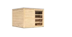 Vor aufsteigender Nässe schützen Sie ein Massivholzboden mit Nut und Feder und eine Rahmenkonstruktion aus kesseldruckimprägnierten Bodenbalken. Für ein angenehmes Liege- bzw. Sitzgefühl während des Saunierens sorgen drei 57cm breite Saunabänke aus weichem Espenholz.