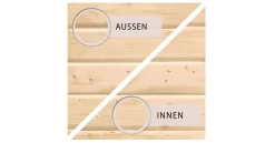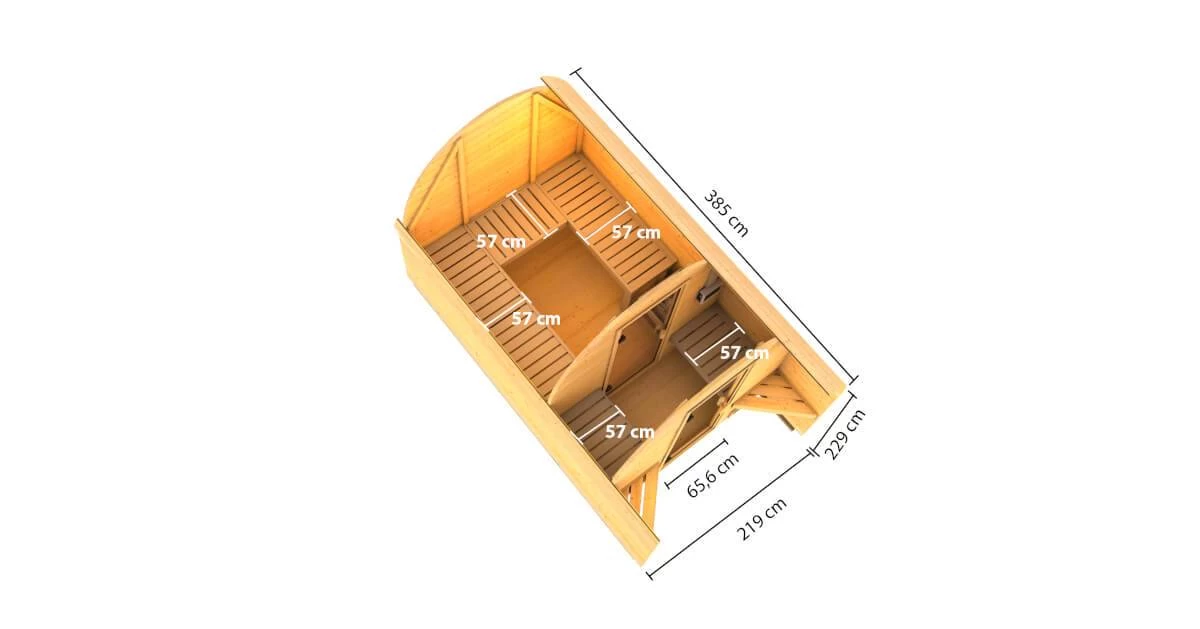 Das Fasshaus aus 38 mm starker, nordischer Fichte wird im Steck-/Schraubsystem montiert. Mit einem Gesamtmaß von 219 cm x 385 cm bietet es genügend Platz zum Entspannen. Innen bieten 3 Saunabänke aus Fichte Platz zum Liegen. Das formschöne und praktische Tonnendach sorgt für den Witterungsschutz von oben. Betreten werden kann das Saunahaus durch eine bronzierte Ganzglastür mit Magnetverschluss. Ein Ofenschutzgitter und alle notwendigen Schrauben und Beschläge sowie eine aussagekräftige Montageanleitung sind selbstverständlich ebenfalls dabei.