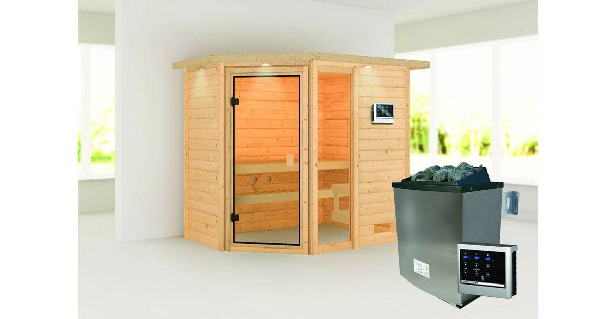 Karibu 38mm Massivholzsauna Jada mit Dachkranz + 9kW Saunaofen mit externer Steuerung