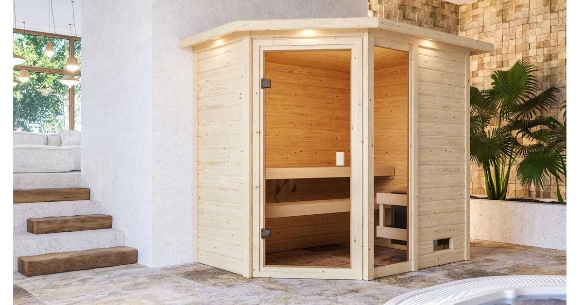 Was eignet sich für einen bislang ungenutzten Kellerraum besser, als eine eigene Sauna zum Entspannen und Wohlfühlen? Die Sauna Sauna Jada hat ein Außenmaß von 224 x 160 cm und ist, aufgrund seiner geringen Höhe von 191 cm, ideal auch für Räume mit einer niedrigen Deckenhöhe geeignet. Die Massivholzsauna besteht aus 38mm starken Wandbohlen aus nordischer Fichte, welche im einfachen Steck- und Schraubsystem montiert werden. Durch den Eckeinstieg und die besondere, fünfeckige Form, sorgt die Sauna für ein Highlight in Ihrer Wellness-Oase. Mit einem optional wählbaren Dachkranz inkl. 3 LED-Spots, können Sie die Sauna von außen beleuchten und sie so gekonnt in Szene setzen. In den Innenraum gelangen Sie durch eine bronzierte Ganzglastür aus Einscheibensicherheitsglas. Damit beim Saunieren keine Wärme entweichen kann, wird die Tür durch eine Magnetverschlusstechnik geschlossen gehalten. Auf den, im Lieferumfang enthaltenen, Liegen können Sie den Saunagang so richtig genießen. Verschönern Sie das Ambiente in Ihrer Sauna und sorgen Sie für die größtmögliche Erholung mit unserem optional erhältlichen Zubehör. Eine Saunalampe Classic in der Ecke, eine ergonomische Kopfstütze für die perfekte Liegeposition oder eine Salzkristall Vital Sole für freies Atmen macht Ihren Saunagang zu einem perfekten Erlebnis. Entspannen Sie nach einem stressigen Arbeitstag und schöpfen Sie neue Kraft aus der angenehmen Wärme auf Ihrer Haut. Heizen Sie den Innenraum mit einem optional erhältlichen, klassischen 9kW-Ofen. Dieser sorgt aufgrund seiner höheren Leistung für höhere Temperaturen und für ein angenehmes Klima im Innenraum. Der Saunaofen ist in einer Variante mit integrierter Steuerung, einer mit externer Steuerung und als Bio-Kombiofen erhältlich. Nutzen Sie Ihren Kellerraum zur Entspannung und verwandeln Sie ihn in eine Wellness-Oase mit der Massivholzsauna Sauna Jada.