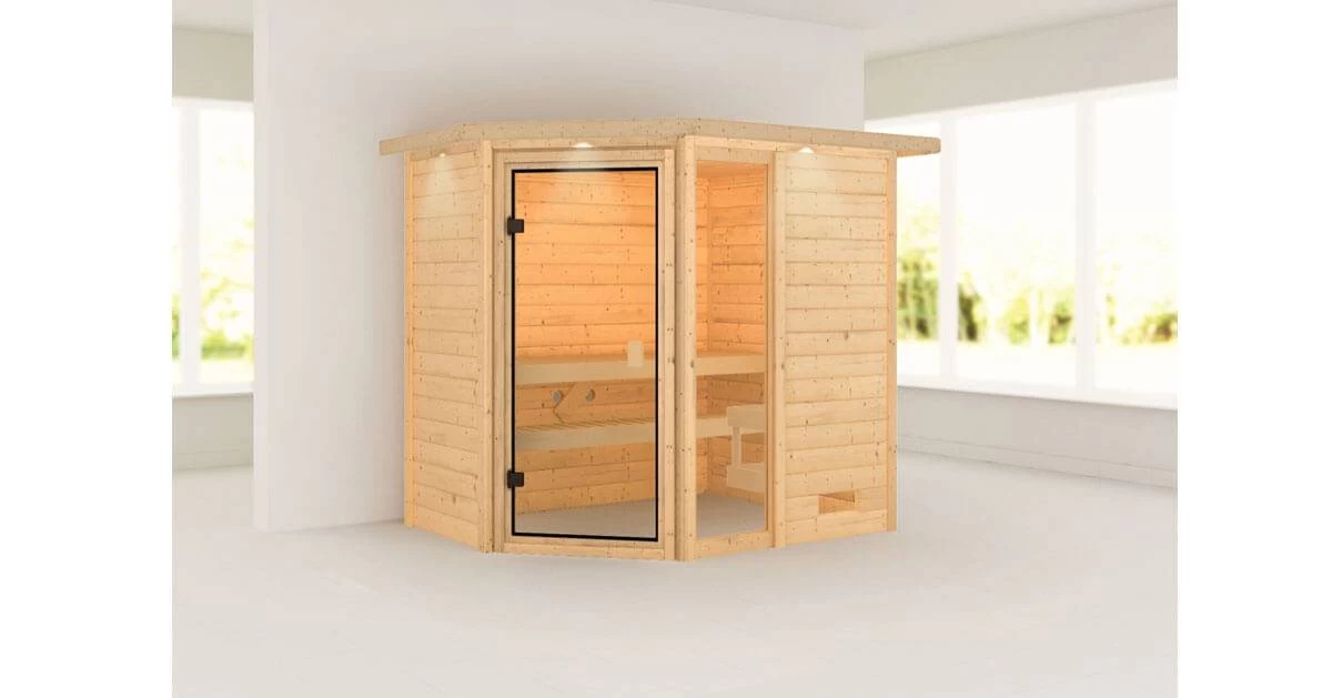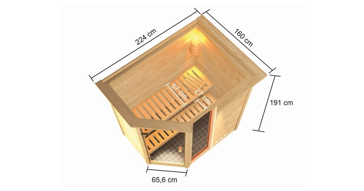 Was eignet sich für einen bislang ungenutzten Kellerraum besser, als eine eigene Sauna zum Entspannen und Wohlfühlen? Die Sauna Sauna Jada hat ein Außenmaß von 224 x 160 cm und ist, aufgrund seiner geringen Höhe von 191 cm, ideal auch für Räume mit einer niedrigen Deckenhöhe geeignet. Die Massivholzsauna besteht aus 38mm starken Wandbohlen aus nordischer Fichte, welche im einfachen Steck- und Schraubsystem montiert werden. Durch den Eckeinstieg und die besondere, fünfeckige Form, sorgt die Sauna für ein Highlight in Ihrer Wellness-Oase. Mit einem optional wählbaren Dachkranz inkl. 3 LED-Spots, können Sie die Sauna von außen beleuchten und sie so gekonnt in Szene setzen. In den Innenraum gelangen Sie durch eine bronzierte Ganzglastür aus Einscheibensicherheitsglas. Damit beim Saunieren keine Wärme entweichen kann, wird die Tür durch eine Magnetverschlusstechnik geschlossen gehalten. Auf den, im Lieferumfang enthaltenen, Liegen können Sie den Saunagang so richtig genießen. Verschönern Sie das Ambiente in Ihrer Sauna und sorgen Sie für die größtmögliche Erholung mit unserem optional erhältlichen Zubehör. Eine Saunalampe Classic in der Ecke, eine ergonomische Kopfstütze für die perfekte Liegeposition oder eine Salzkristall Vital Sole für freies Atmen macht Ihren Saunagang zu einem perfekten Erlebnis. Entspannen Sie nach einem stressigen Arbeitstag und schöpfen Sie neue Kraft aus der angenehmen Wärme auf Ihrer Haut. Heizen Sie den Innenraum mit einem optional erhältlichen, klassischen 9kW-Ofen. Dieser sorgt aufgrund seiner höheren Leistung für höhere Temperaturen und für ein angenehmes Klima im Innenraum. Der Saunaofen ist in einer Variante mit integrierter Steuerung, einer mit externer Steuerung und als Bio-Kombiofen erhältlich. Nutzen Sie Ihren Kellerraum zur Entspannung und verwandeln Sie ihn in eine Wellness-Oase mit der Massivholzsauna Sauna Jada.