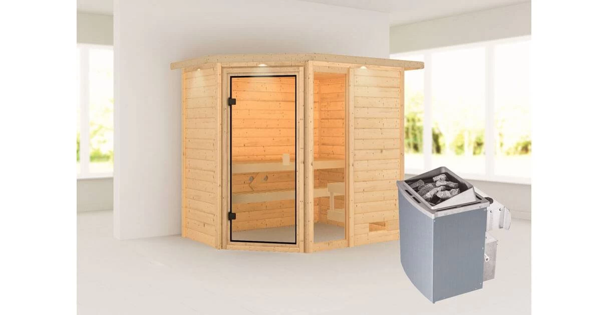 Karibu 38mm Massivholzsauna Jada mit Dachkranz + 9kW Saunaofen mit integrierter Steuerung