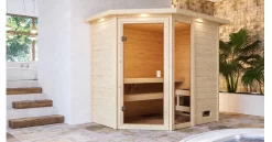 Was eignet sich für einen bislang ungenutzten Kellerraum besser, als eine eigene Sauna zum Entspannen und Wohlfühlen? Die Sauna Jada hat ein Außenmaß von 224 x 160 cm und ist, aufgrund seiner geringen Höhe von 191 cm, ideal auch für Räume mit einer niedrigen Deckenhöhe geeignet. Die Massivholzsauna besteht aus 38mm starken Wandbohlen aus nordischer Fichte, welche im einfachen Steck- und Schraubsystem montiert werden. Durch den Eckeinstieg und die besondere, fünfeckige Form, sorgt die Sauna für ein Highlight in Ihrer Wellness-Oase. Mit einem optional wählbaren Dachkranz inkl. 3 LED-Spots, können Sie die Sauna von außen beleuchten und sie so gekonnt in Szene setzen. In den Innenraum gelangen Sie durch eine bronzierte Ganzglastür aus Einscheibensicherheitsglas. Damit beim Saunieren keine Wärme entweichen kann, wird die Tür durch eine Magnetverschlusstechnik geschlossen gehalten. Auf den, im Lieferumfang enthaltenen, Liegen können Sie den Saunagang so richtig genießen. Verschönern Sie das Ambiente in Ihrer Sauna und sorgen Sie für die größtmögliche Erholung mit unserem optional erhältlichen Zubehör. Eine Saunalampe Classic in der Ecke, eine ergonomische Kopfstütze für die perfekte Liegeposition oder eine Salzkristall Vital Sole für freies Atmen macht Ihren Saunagang zu einem perfekten Erlebnis. Entspannen Sie nach einem stressigen Arbeitstag und schöpfen Sie neue Kraft aus der angenehmen Wärme auf Ihrer Haut. Heizen Sie den Innenraum mit einem optional erhältlichen, klassischen 9kW-Ofen. Dieser sorgt aufgrund seiner höheren Leistung für höhere Temperaturen und für ein angenehmes Klima im Innenraum. Der Saunaofen ist in einer Variante mit integrierter Steuerung, einer mit externer Steuerung und als Bio-Kombiofen erhältlich. Nutzen Sie Ihren Kellerraum zur Entspannung und verwandeln Sie ihn in eine Wellness-Oase mit der Massivholzsauna Sauna Jada.