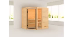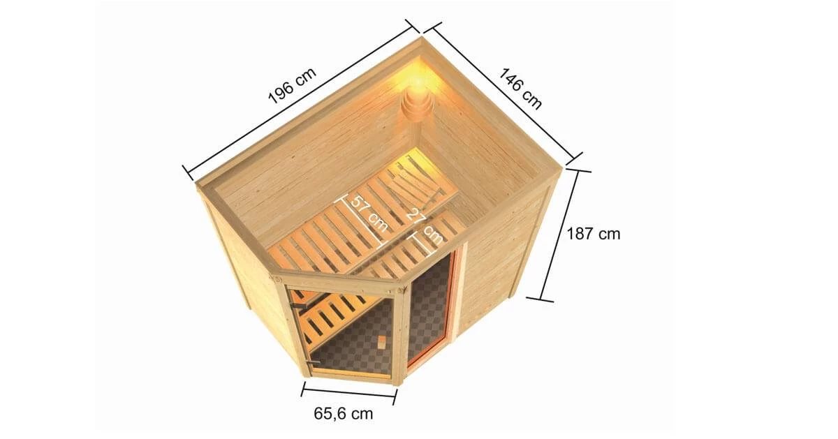 Was eignet sich für einen bislang ungenutzten Kellerraum besser, als eine eigene Sauna zum Entspannen und Wohlfühlen? Die Sauna Sauna Jada hat ein Außenmaß von 196 x 146 cm und ist, aufgrund seiner geringen Höhe von 187 cm, ideal auch für Räume mit einer niedrigen Deckenhöhe geeignet. Die Massivholzsauna besteht aus 38mm starken Wandbohlen aus nordischer Fichte, welche im einfachen Steck- und Schraubsystem montiert werden. Durch den Eckeinstieg und die besondere, fünfeckige Form, sorgt die Sauna für ein Highlight in Ihrer Wellness-Oase. Mit einem optional wählbaren Dachkranz inkl. 3 LED-Spots, können Sie die Sauna von außen beleuchten und sie so gekonnt in Szene setzen. In den Innenraum gelangen Sie durch eine bronzierte Ganzglastür aus Einscheibensicherheitsglas. Damit beim Saunieren keine Wärme entweichen kann, wird die Tür durch eine Magnetverschlusstechnik geschlossen gehalten. Auf den, im Lieferumfang enthaltenen, Liegen können Sie den Saunagang so richtig genießen. Verschönern Sie das Ambiente in Ihrer Sauna und sorgen Sie für die größtmögliche Erholung mit unserem optional erhältlichen Zubehör. Eine Saunalampe Classic in der Ecke, eine ergonomische Kopfstütze für die perfekte Liegeposition oder eine Salzkristall Vital Sole für freies Atmen macht Ihren Saunagang zu einem perfekten Erlebnis. Entspannen Sie nach einem stressigen Arbeitstag und schöpfen Sie neue Kraft aus der angenehmen Wärme auf Ihrer Haut. Heizen Sie den Innenraum mit einem optional erhältlichen, klassischen 9kW-Ofen. Dieser sorgt aufgrund seiner höheren Leistung für höhere Temperaturen und für ein angenehmes Klima im Innenraum. Der Saunaofen ist in einer Variante mit integrierter Steuerung, einer mit externer Steuerung und als Bio-Kombiofen erhältlich. Nutzen Sie Ihren Kellerraum zur Entspannung und verwandeln Sie ihn in eine Wellness-Oase mit der Massivholzsauna Sauna Jada.