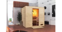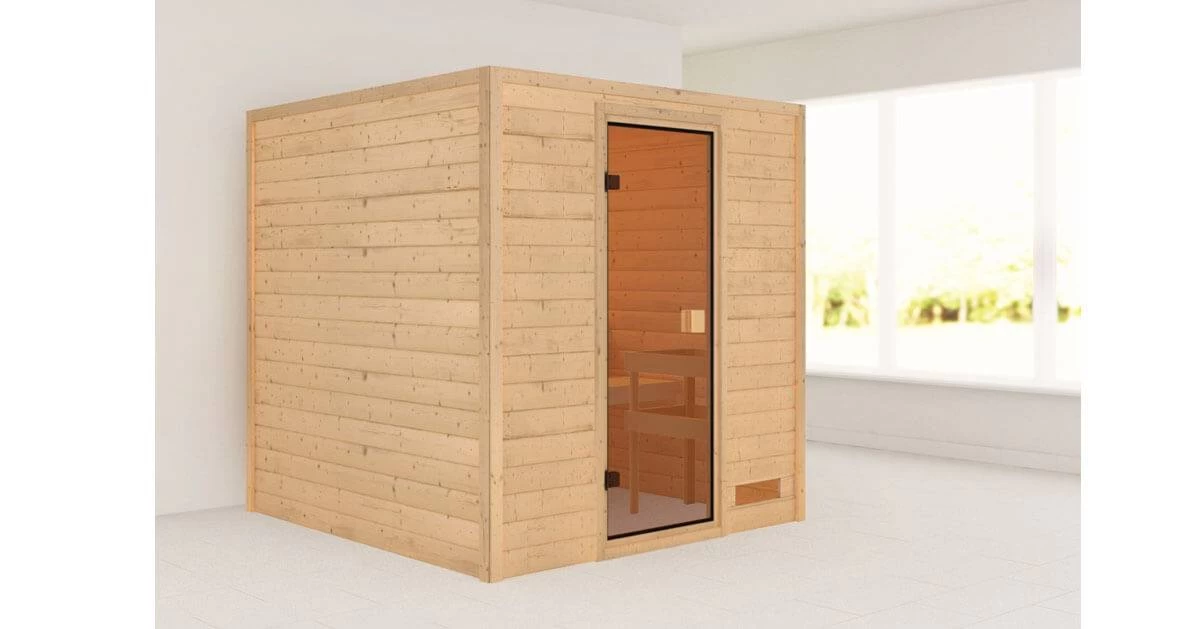 Die Sauna Jara hat ein Außenmaß von 195 x 195 cm und ist, aufgrund seiner geringen Höhe von 187 cm, ideal auch für Räume mit einer niedrigen Deckenhöhe geeignet. Die Massivholzsauna besteht aus 38mm starken Wandbohlen aus nordischer Fichte, welche im einfachen Steck- und Schraubsystem montiert werden. Durch den Fronteinstieg und die schlichte, rechteckige Form passt sie sich jeder Umgebung mühelos an. Mit einem optional wählbaren Dachkranz inkl. 3 LED-Spots, können Sie die Sauna von außen beleuchten und sie so gekonnt in Szene setzen. In den Innenraum gelangen Sie durch eine bronzierte Ganzglastür aus Einscheibensicherheitsglas. Damit beim Saunieren keine Wärme entweichen kann, wird die Tür durch eine Magnetverschlusstechnik geschlossen gehalten. Auf den, im Lieferumfang enthaltenen, Liegen können Sie den Saunagang so richtig genießen. Verschönern Sie das Ambiente in Ihrer Sauna und sorgen Sie für die größtmögliche Erholung mit unserem optional erhältlichen Zubehör. Eine Saunalampe Classic in der Ecke, eine ergonomische Kopfstütze für die perfekte Liegeposition oder eine Salzkristall Vital Sole für freies Atmen macht Ihren Saunagang zu einem perfekten Erlebnis. Entspannen Sie nach einem stressigen Arbeitstag und schöpfen Sie neue Kraft aus der angenehmen Wärme auf Ihrer Haut. Heizen Sie den Innenraum mit einem optional erhältlichen, klassischen4,5kW-Ofen. Dieser sorgt aufgrund seiner höheren Leistung für höhere Temperaturen und für ein angenehmes Klima im Innenraum. Der Saunaofen ist in einer Variante mit integrierter Steuerung, einer mit externer Steuerung und als Bio-Kombiofen erhältlich. Nutzen Sie Ihren Kellerraum zur Entspannung und verwandeln Sie ihn in eine Wellness-Oase mit der Massivholzsauna Sauna Jara.