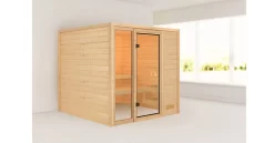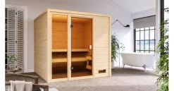 Was eignet sich für einen bislang ungenutzten Kellerraum besser, als eine eigene Sauna zum Entspannen und Wohlfühlen? Die Sauna Jutta hat ein Außenmaß von 196 x 196 cm und ist, aufgrund seiner geringen Höhe von 187 cm, ideal auch für Räume mit einer niedrigen Deckenhöhe geeignet. Die Massivholzsauna besteht aus 38mm starken Wandbohlen aus nordischer Fichte, welche im einfachen Steck- und Schraubsystem montiert werden. Durch den Fronteinstieg und die schlichte, rechteckige Form passt sie sich jeder Umgebung mühelos an. Mit einem optional wählbaren Dachkranz inkl. 3 LED-Spots, können Sie die Sauna von außen beleuchten und sie so gekonnt in Szene setzen. In den Innenraum gelangen Sie durch eine bronzierte Ganzglastür aus Einscheibensicherheitsglas. Damit beim Saunieren keine Wärme entweichen kann, wird die Tür durch eine Magnetverschlusstechnik geschlossen gehalten. Auf den, im Lieferumfang enthaltenen, Liegen können Sie den Saunagang so richtig genießen. Verschönern Sie das Ambiente in Ihrer Sauna und sorgen Sie für die größtmögliche Erholung mit unserem optional erhältlichen Zubehör. Eine Saunalampe Classic in der Ecke, eine ergonomische Kopfstütze für die perfekte Liegeposition oder eine Salzkristall Vital Sole für freies Atmen macht Ihren Saunagang zu einem perfekten Erlebnis. Entspannen Sie nach einem stressigen Arbeitstag und schöpfen Sie neue Kraft aus der angenehmen Wärme auf Ihrer Haut. Heizen Sie den Innenraum mit einem optional erhältlichen, klassischen 9kW-Ofen. Dieser sorgt aufgrund seiner höheren Leistung für höhere Temperaturen und für ein angenehmes Klima im Innenraum. Der Saunaofen ist in einer Variante mit integrierter Steuerung, einer mit externer Steuerung und als Bio-Kombiofen erhältlich. Nutzen Sie Ihren Kellerraum zur Entspannung und verwandeln Sie ihn in eine Wellness-Oase mit der Massivholzsauna Sauna Jutta.