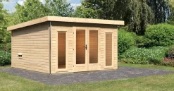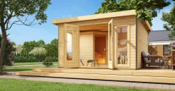 Unsere Saunahaus-Reihe Mainburg überzeugt mit großem Vorraum (Fronteinstieg), welcher individuell genutzt werden kann. Zudem kann man die Sauna im Inneren (Eckeinstieg) aus zwei verschiedenen Größen wählen.