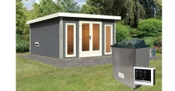 Karibu 38mm Saunahaus Mainburg 3 terragrau + 9 kW Saunaofen mit ext. Steuerung Easy