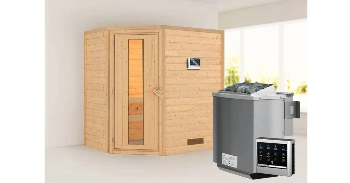Karibu 38mm Massivholzsauna Mia mit 9kW BIO-Kombiofen mit ext. Steuerung Easy