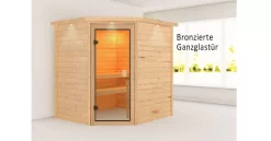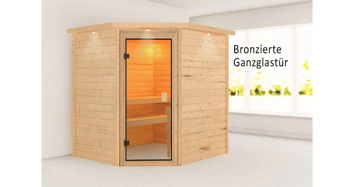 Rundum Massiv mit der Massivholz-Sauna Mia schaffen Sie sich einen Ort der Ruhe und Entspannung in den eigenen vier Wänden. Die stabile Konstruktion mit 38mm Bohlen aus nordischem Fichtenholz wird im einfachen Steck-/ Schraubsystem montiert. Ein optional wählbarer Dachkranz inkl. 3 LED-Spots setzt die Sauna gekonnt in Szene. Wählen Sie eine der vier Türvarianten und passen Sie Ihre Sauna Ihren Vorstellungen optimal an. Ob energiesparend mit einer Holztür mit Isolierglas, klassisch mit einer bronzierten Ganzglastür, modern mit einer Ganzglastür in graphitfarben oder schlicht mit einer Klarglas Ganzglastür. Hier ist garantiert das Richtige für Sie dabei. Mit einem Außenmaß von 196 x 170 x 198 cm (B/T/H) besitzt die Sauna Mia die ideale Größe zum Entspannen und Wohlfühlen. Erweitern Sie Ihre Möglichkeiten mit dem optional erhältlichen 4,5kW-Bio-Kombiofen. Neben einer klassischen finnischen Sauna haben Sie hier die Möglichkeit einer Kräuterdampf-Kur, einem Dampfbad und einer Familiensauna. So wird es zu einem Saunaerlebnis für die ganze Familie. Lassen Sie sich von der wohltuenden Wirkung des Saunabadens überzeugen. Bei regelmäßiger Anwendung fühlen Sie sich nicht nur deutlich entspannter. Zusätzlich wirkt es sich positiv auf den Stoffwechsel aus, Reinig unsere Haut und entspannt die Muskulatur. Mit einer optional erhältlichen Salzkristall Vital Sole oder der Salzkristall-Leuchte können Sie Ihre Atemwege befreien und wieder tief ein- und ausatmen. Genießen Sie die zahlreichen Vorteile des Saunieren und schaffe Sie einen Ort der Ruhe mit der Massivholz-Sauna Mia.