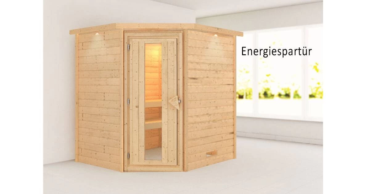 Karibu 38mm Massivholzsauna Mia mit Dachkranz + 9kW Saunaofen (externe Steuerung)