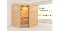 Rundum Massiv – mit der Massivholz-Sauna Mia schaffen Sie sich einen Ort der Ruhe und Entspannung in den eigenen vier Wänden. Die stabile Konstruktion mit 38mm Bohlen aus nordischem Fichtenholz wird im einfachen Steck-/ Schraubsystem montiert. Ein optional wählbarer Dachkranz inkl. 3 LED-Spots setzt die Sauna gekonnt in Szene. Wählen Sie eine der vier Türvarianten und passen Sie Ihre Sauna Ihren Vorstellungen optimal an. Ob energiesparend mit einer Holztür mit Isolierglas, klassisch mit einer bronzierten Ganzglastür, modern mit einer Ganzglastür in graphitfarben oder schlicht mit einer Klarglas Ganzglastür. Hier ist garantiert das Richtige für Sie dabei. Mit einem Außenmaß von 224 x 184 x 202 cm (B/T/H) besitzt die Sauna Mia die ideale Größe zum Entspannen und Wohlfühlen. Erweitern Sie Ihre Möglichkeiten mit dem optional erhältlichen 9kW-Bio-Kombiofen. Neben einer klassischen finnischen Sauna haben Sie hier die Möglichkeit einer Kräuterdampf-Kur, einem Dampfbad und einer Familiensauna. So wird es zu einem Saunaerlebnis für die ganze Familie. Lassen Sie sich von der wohltuenden Wirkung des Saunabadens überzeugen. Bei regelmäßiger Anwendung fühlen Sie sich nicht nur deutlich entspannter. Zusätzlich wirkt es sich positiv auf den Stoffwechsel aus, Reinig unsere Haut und entspannt die Muskulatur. Mit einer optional erhältlichen Salzkristall Vital Sole oder der Salzkristall-Leuchte können Sie Ihre Atemwege befreien und wieder tief ein- und ausatmen. Genießen Sie die zahlreichen Vorteile des Saunieren und schaffe Sie einen Ort der Ruhe mit der Massivholz-Sauna Mia.