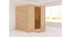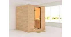 Ein Ort der Ruhe und Entspannung in den eigenen Vier Wänden. Nach einem stressigen Tag die Seele baumeln lassen und sich von der wohligen Wärme in einer Sauna verwöhnen ohne das Haus verlassen zu müssen. Dies ist möglich mit unserer 38 mm Massivholzsauna Mojave. Die stabile Konstruktion mit 38 mm Bohlen aus nordischem Fichtenholz wird im einfachen Steck-/ Schraubsystem montiert. Durch die massiven Vollholzwände wird im Saunainneren ein ideales Raumklima nach finnischem Vorbild geschaffen. Ein optional wählbarer Dachkranz inkl. 3 LED-Spots setzt die Sauna gekonnt in Szene. Wählen Sie eine von vier möglichen Türvarianten und passen Sie Ihre Sauna den eigenen Vorstellungen optimal an. Ob energiesparend mit einer Holztür mit Isolierglas, klassisch mit einer bronzierten Ganzglastür, modern mit einer Ganzglastür in graphitfarben oder schlicht mit einer klaren Ganzglastür. Hier ist garantiert das Richtige für Sie dabei. Mit einem Außenmaß von 196 x 196 x 200 cm (B/T/H) besitzt die Sauna Mojave die ideale Größe zum Entspannen und Wohlfühlen. Erweitern Sie Ihre Möglichkeiten mit dem optional erhältlichen 9kW-Bio-Kombiofen. Neben einer klassischen finnischen Sauna haben Sie hier die Möglichkeit einer Kräuterdampf-Kur, einem Dampfbad und einer Familiensauna. So wird es zu einem Saunaerlebnis für die ganze Familie. Lassen Sie sich von der wohltuenden Wirkung des Saunabadens überzeugen. Bei regelmäßiger Anwendung fühlen Sie sich nicht nur deutlich entspannter. Zusätzlich wirkt es sich positiv auf den Stoffwechsel aus, verfeinert das Hautbild und unterstützt den Stressabbau. Um ein besonderes Sauna-Gefühl zu schaffen, wird die Sauna mit Saunaliegen und einer Kopfstütze ausgestattet. Durch eine extra breite Saunaliege von 62cm Breite wird Ihnen ein besonders angenehmer Liegekomfort geboten. Ein Ofenschutzgitter schützt Sie vor Verbrennungen durch den Saunaofen. Mit einer optional erhältlichen Salzkristall Vital Sole oder der Salzkristall-Leuchte können Sie Ihre Atemwege befreien und wieder tief ein- und ausatmen. Genießen Sie die zahlreichen Vorteile des Saunieren und schaffe Sie einen Ort der Ruhe mit der Massivholzsauna Mojave.