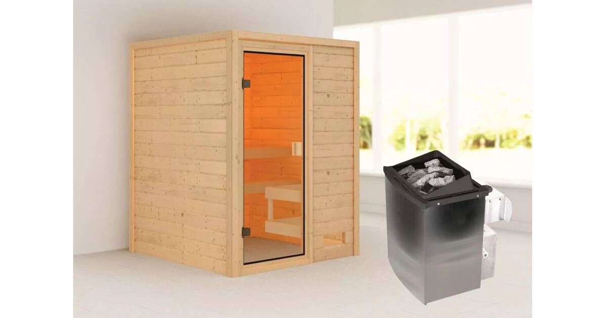 2 stabile Liegen aus Massivholz, 9kW Saunaofen mit integrierter Steuerung, Ofenschutzgitter, Montageanleitung
