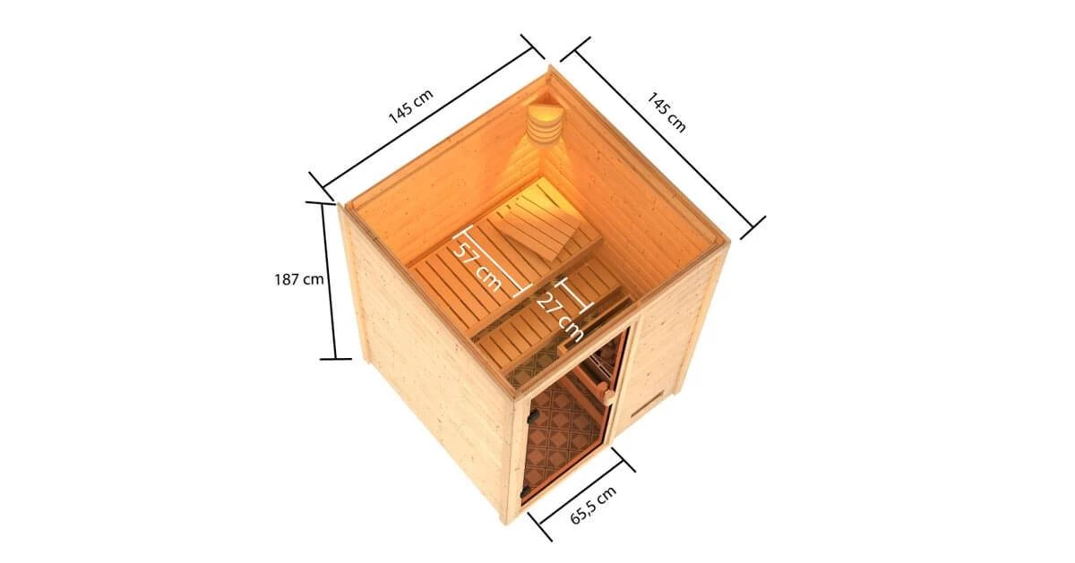 Was eignet sich für einen bislang ungenutzten Kellerraum besser, als eine eigene Sauna zum Entspannen und Wohlfühlen? Die Sauna Sandra hat ein Außenmaß von 145 x 145 cm und ist, aufgrund seiner geringen Höhe von 187 cm, ideal auch für Räume mit einer niedrigen Deckenhöhe geeignet. Die Massivholzsauna besteht aus 38mm starken Wandbohlen aus nordischer Fichte, welche im einfachen Steck- und Schraubsystem montiert werden. Durch den Fronteinstieg und die schlichte, rechteckige Form passt sie sich jeder Umgebung mühelos an. Mit einem optional wählbaren Dachkranz inkl. 3 LED-Spots, können Sie die Sauna von außen beleuchten und sie so gekonnt in Szene setzen. In den Innenraum gelangen Sie durch eine bronzierte Ganzglastür aus Einscheibensicherheitsglas. Damit beim Saunieren keine Wärme entweichen kann, wird die Tür durch eine Magnetverschlusstechnik geschlossen gehalten. Auf denen, im Lieferumfang enthaltenen, Liegen können Sie den Saunagang so richtig genießen. Entspannen Sie nach einem stressigen Arbeitstag und schöpfen Sie neue Kraft aus der angenehmen Wärme auf Ihrer Haut. Heizen Sie den Innenraum mit einem optional erhältlichen, steckerfertigen 3,6kW Ofen. Dieser hat den Vorteil, dass er einfach an eine hausübliche 240Volt Steckdose angeschlossen werden kann und so keine Montage- oder Umbaukosten erfordert. Oder wählen Sie unseren klassischen Ofen. Dieser schafft, aufgrund der höheren Leistung, eine höhere maximal Temperatur. Beide Öfen sind in drei verschiedenen Varianten erhältlich. Nutzen Sie Ihren Kellerraum zur Entspannung und verwandeln Sie ihn in eine Wellness-Oase mit der Massivholzsauna Sauna Sandra.