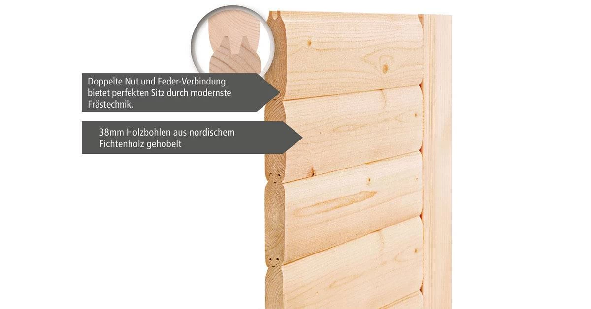 Karibu 38mm Massivholzsauna Sandra mit 9kW Saunaofen