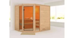 Ein Ort der Ruhe und Entspannung in den eigenen Vier Wänden. Nach einem stressigen Tag die Seele baumeln lassen und sich von der wohligen Wärme in einer Sauna verwöhnen ohne das Haus verlassen zu müssen. Dies ist möglich mit unserer 38mm Massivholzsauna Sinai 3. Die stabile Konstruktion mit 38mm Bohlen aus nordischem Fichtenholz wird im einfachen Steck-/ Schraubsystem montiert. Durch die massiven Vollholzwände wird im Saunainneren ein ideales Raumklima nach finnischem Vorbild geschaffen. Ein optional wählbarer Dachkranz inkl. 3 LED-Spots setzt die Sauna gekonnt in Szene. Das Innere der Sauna erreichen Sie durch eine bronzierte Ganzglastür aus Einscheibensicherheitsglas mit Karibu-Türgriff. Durch die Tür und die beiden bronzierten Fenster gelangt Licht in den Innenraum und sorgt durch die bronzierten Gläser für ein warmes Ambiente. Mit einem Außenmaß von 236 x 184 x 209 cm (H/B/T) besitzt die Sauna Sinai 3 die ideale Größe zum Entspannen und Wohlfühlen. Erweitern Sie Ihre Möglichkeiten mit dem optional erhältlichen 9kW-Bio-Kombiofen. Neben einer klassischen finnischen Sauna haben Sie hier die Möglichkeit einer Kräuterdampf-Kur, einem Dampfbad und einer Familiensauna. So wird es zu einem Saunaerlebnis für die ganze Familie. Lassen Sie sich von der wohltuenden Wirkung des Saunabadens überzeugen. Bei regelmäßiger Anwendung fühlen Sie sich nicht nur deutlich entspannter. Zusätzlich wirkt es sich positiv auf den Stoffwechsel aus, verfeinert das Hautbild und unterstützt den Stressabbau. Um ein besonderes Sauna-Gefühl zu schaffen, wird die Sauna mit 3 Saunaliegen und einer Kopfstütze ausgestattet. Durch eine extra breite Saunaliege von 62cm Breite wird Ihnen ein besonders angenehmer Liegekomfort geboten. Ein Ofenschutzgitter schützt Sie vor Verbrennungen durch den Saunaofen. Mit einer optional erhältlichen Salzkristall Vital Sole oder der Salzkristall-Leuchte können Sie Ihre Atemwege befreien und wieder tief ein- und ausatmen. Genießen Sie die zahlreichen Vorteile des Saunieren und schaffe Sie einen Ort der Ruhe mit der MassivholzsaunaSinai 3.