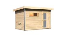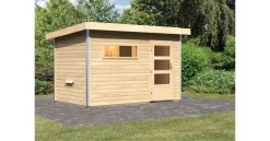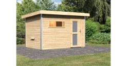 Sie möchten sich vor dem Saunieren in Ruhe in einem angrenzenden Raum entkleiden, sich nach dem Saunagang auf einem gemütlichen Stuhl entspannen oder zum Lagern der benötigten Accessoires nutzen? Diese und viele Vorteile bietet Ihnen die Außensauna Skrollan 1 mit Vorraum. Mit einem Gesamtaußenmaß von337 x 196 x 239 cm (B/H/T) schafft das Haus die nötige Fläche für eine Saunakabine zum Entspannen und einem praktischen Vorraum.