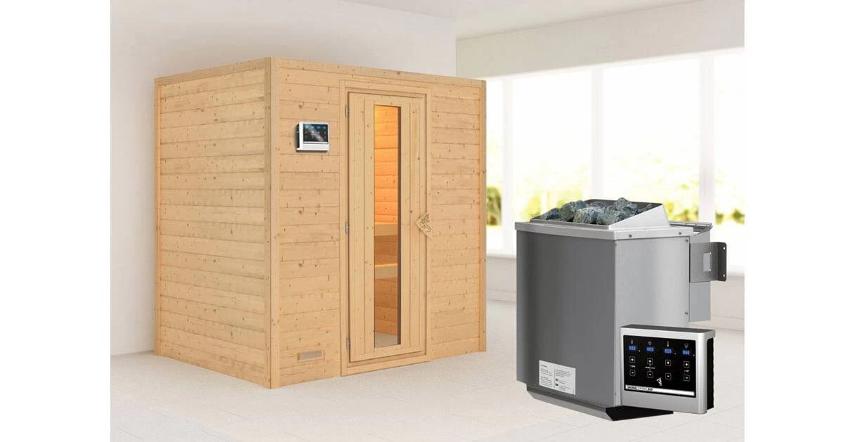 Karibu 38mm Massivholzsauna Sonja mit 9kW BIO-Kombiofen mit ext. Steuerung Easy