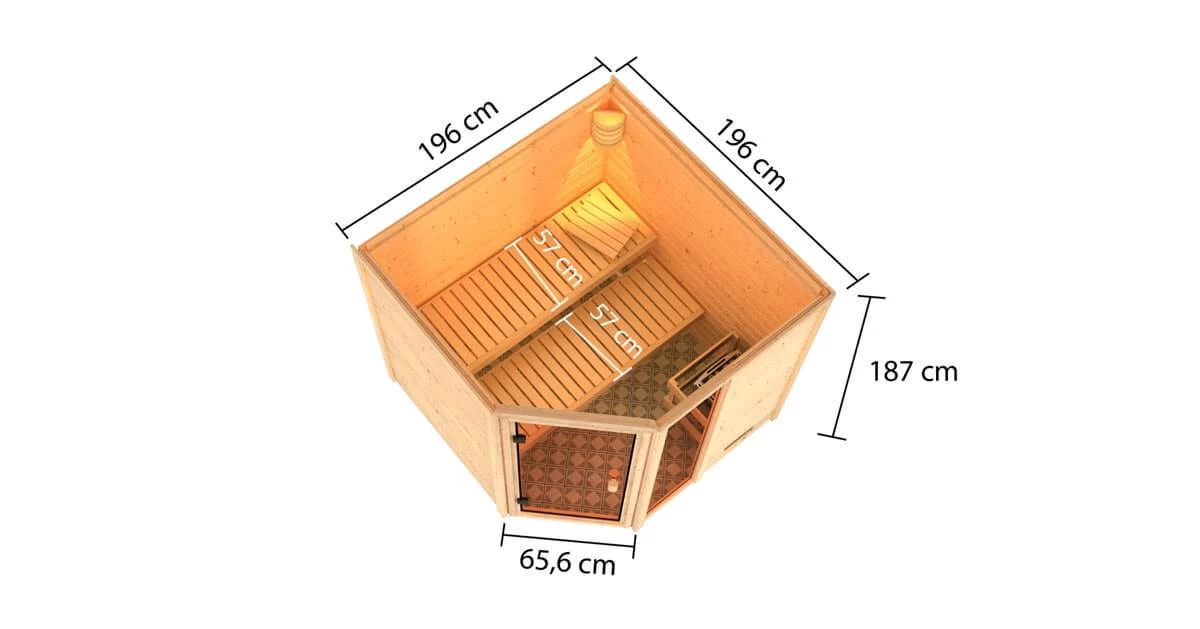 Was eignet sich für einen bislang ungenutzten Kellerraum besser, als eine eigene Sauna zum Entspannen und Wohlfühlen? Die Sauna Sauna Tabea hat ein Außenmaß von 196 x 196 cm und ist, aufgrund seiner geringen Höhe von 187 cm, ideal auch für Räume mit einer niedrigen Deckenhöhe geeignet. Die Massivholzsauna besteht aus 38mm starken Wandbohlen aus nordischer Fichte, welche im einfachen Steck- und Schraubsystem montiert werden. Durch den Eckeinstieg und die besondere, fünfeckige Form, sorgt die Sauna für ein Highlight in Ihrer Wellness-Oase. Mit einem optional wählbaren Dachkranz inkl. 3 LED-Spots, können Sie die Sauna von außen beleuchten und sie so gekonnt in Szene setzen. In den Innenraum gelangen Sie durch eine bronzierte Ganzglastür aus Einscheibensicherheitsglas. Damit beim Saunieren keine Wärme entweichen kann, wird die Tür durch eine Magnetverschlusstechnik geschlossen gehalten. Auf den, im Lieferumfang enthaltenen, Liegen können Sie den Saunagang so richtig genießen. Verschönern Sie das Ambiente in Ihrer Sauna und sorgen Sie für die größtmögliche Erholung mit unserem optional erhältlichen Zubehör. Eine Saunalampe Classic in der Ecke, eine ergonomische Kopfstütze für die perfekte Liegeposition oder eine Salzkristall Vital Sole für freies Atmen macht Ihren Saunagang zu einem perfekten Erlebnis. Entspannen Sie nach einem stressigen Arbeitstag und schöpfen Sie neue Kraft aus der angenehmen Wärme auf Ihrer Haut. Heizen Sie den Innenraum mit einem optional erhältlichen, klassischen 9kW-Ofen. Dieser sorgt aufgrund seiner höheren Leistung für höhere Temperaturen und für ein angenehmes Klima im Innenraum. Der Saunaofen ist in einer Variante mit integrierter Steuerung, einer mit externer Steuerung und als Bio-Kombiofen erhältlich. Nutzen Sie Ihren Kellerraum zur Entspannung und verwandeln Sie ihn in eine Wellness-Oase mit der Massivholzsauna Sauna Tabea.